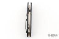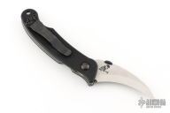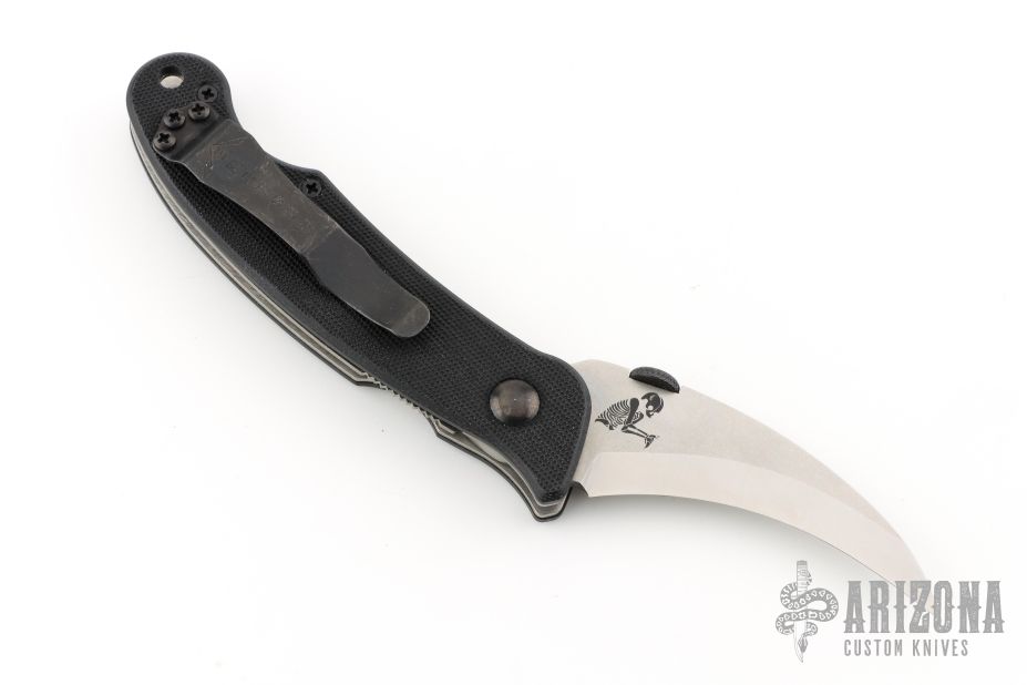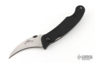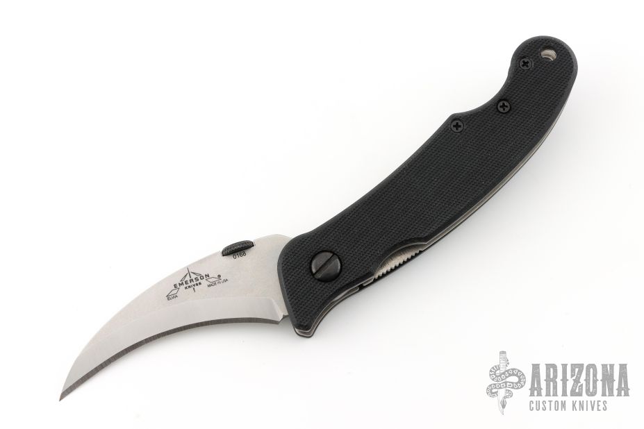 This Elvia by Emerson Knives features a stonewashed hawkbill blade with a black thumbdisc. The handle has black G-10 scales, titanium liners and a secondary deep carry black stainless steel tip up clip. Excellent condition. #0168.