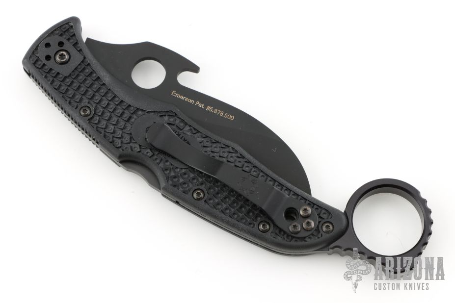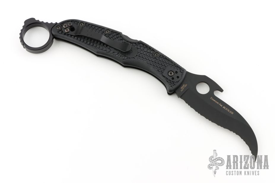 This Matriarch from Spyderco features a black full serrated hawkbill blade with thumbhole and wave features. The handle is black FRN with a black stainless steel tip up clip. Has a custom black signet ring at the butt. Excellent condition.