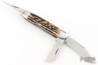 This knife by Tom Ploppert features hand rub satin finished blades with nail nicks. The large single blade is engaged by the lockback. Halfstops and are flush in all positions. The handle has stainless steel bolsters, jigged bone covers with a stainless steel escutcheon, stainless steel liners and springs. Includes a padded zippered case.  Excellent Condition.