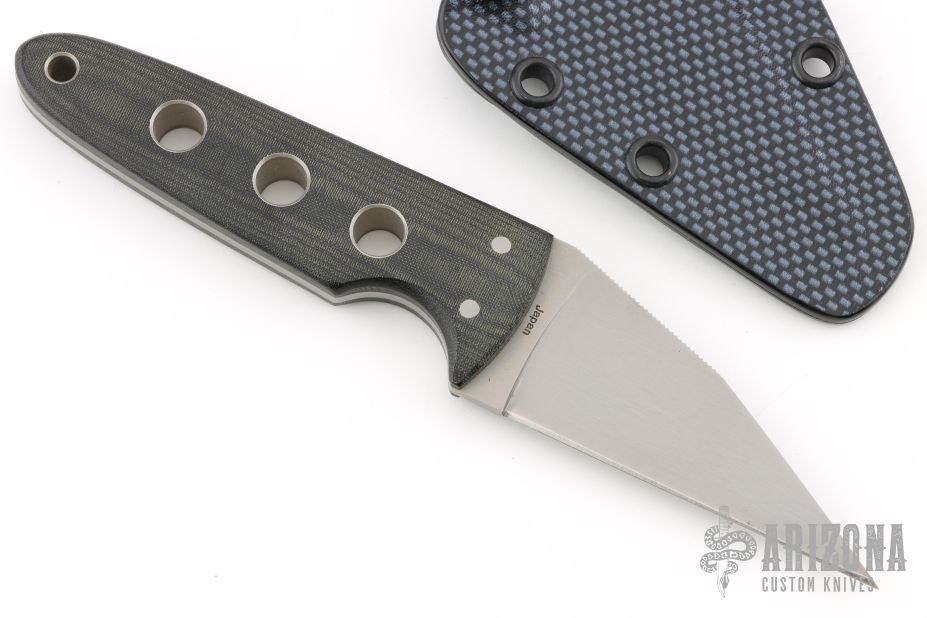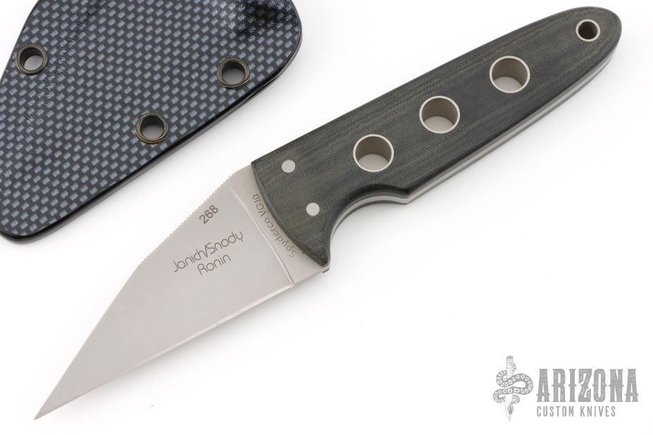 This FB09 Ronin is a Michael Janich/Mike Snody design executed by Spyderco. It features a matte finished wharncliffe style blade with notched thumbrest. The handle is comprised of black linen micarta with hollow pins and lanyard tube over full tang construction. Includes original kydex sheath. Excellent condition.