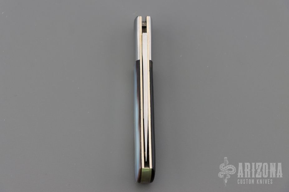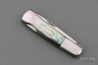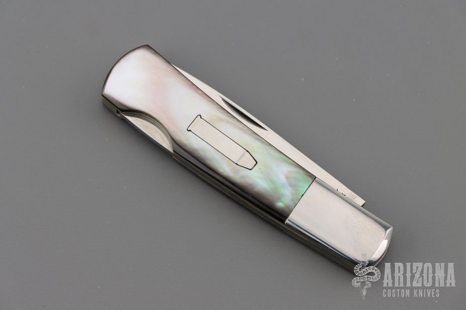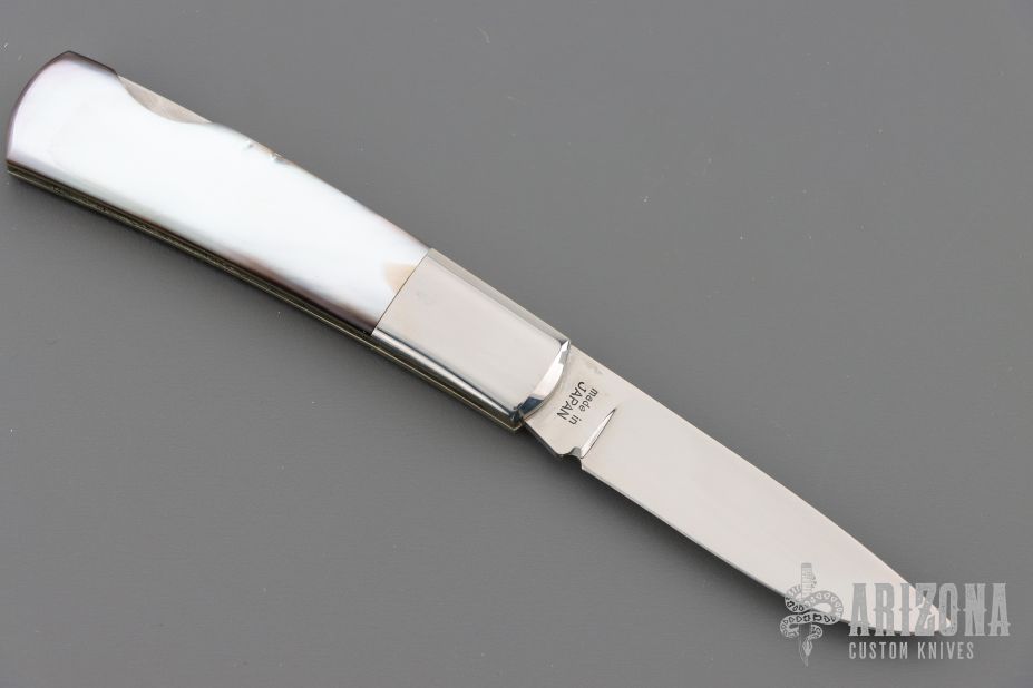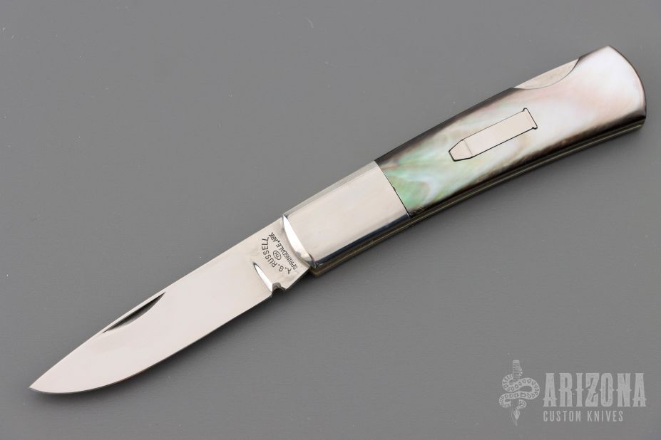 This Lockback by AG Russell features a mirror polished blade with nail nick. The handle has nickel silver bolsters, abalone scales and nickel silver liners. Includes the orignal box. Has some light scratches, otherwise Excellent Condition.