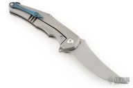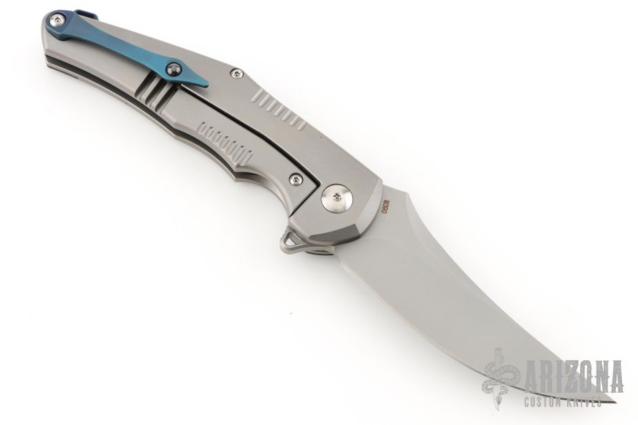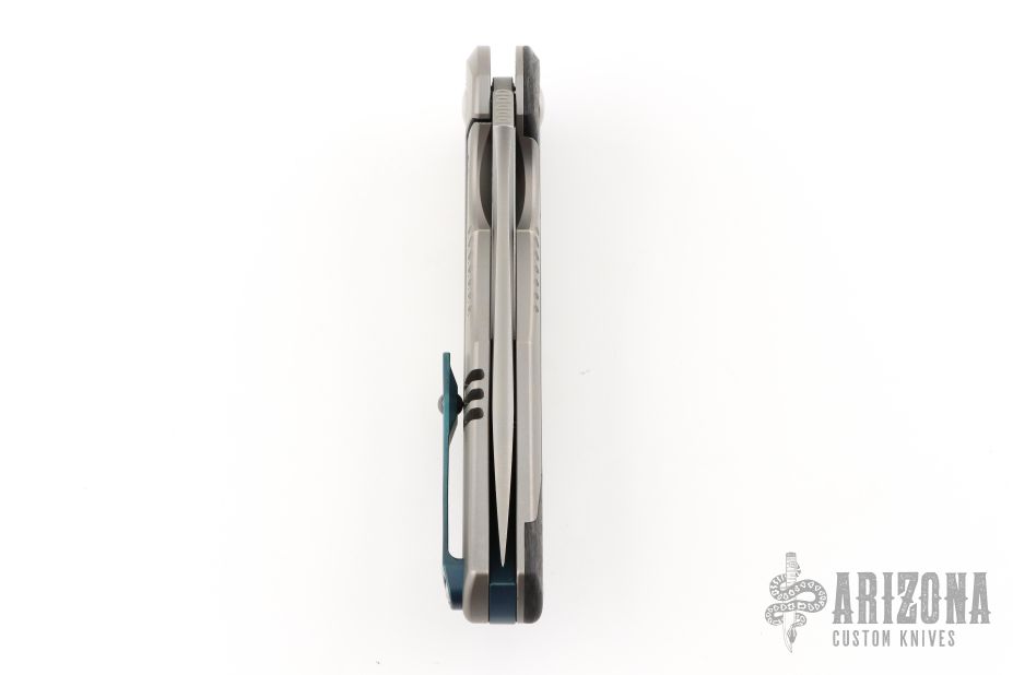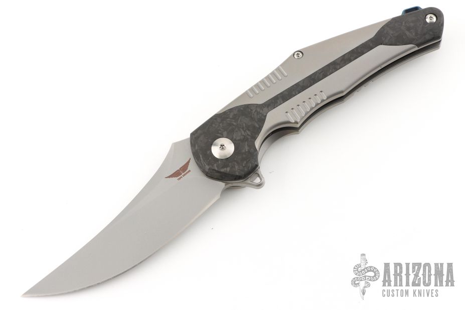 The Kilij is a Persian style folder that features a bead blasted blade with a crowned spine. The show style scale features a hand finished marbled carbon fiber inlay over 6AL4V titianium.