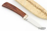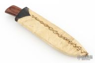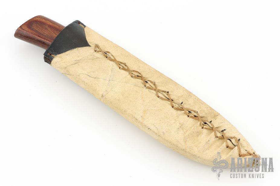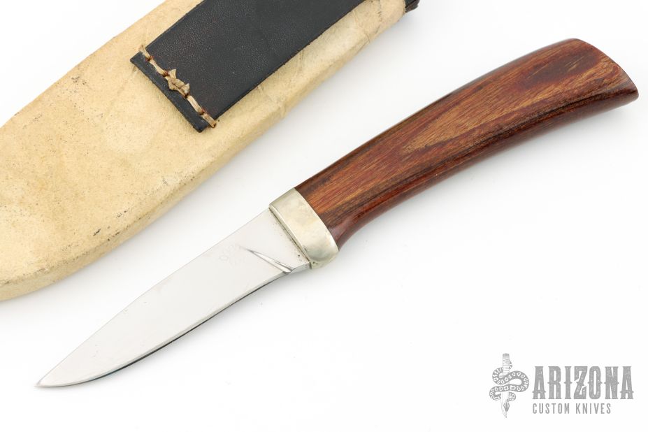 This skinner by Track Knives features a mirror polished blade with .155" blade stock and .885" blade depth, hidden tang construction. The handle has a nickel silver guard and laminated wood grip. Comes with leather sheath. Has some scratches, and patina otherwise excellent condition.
