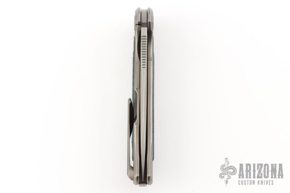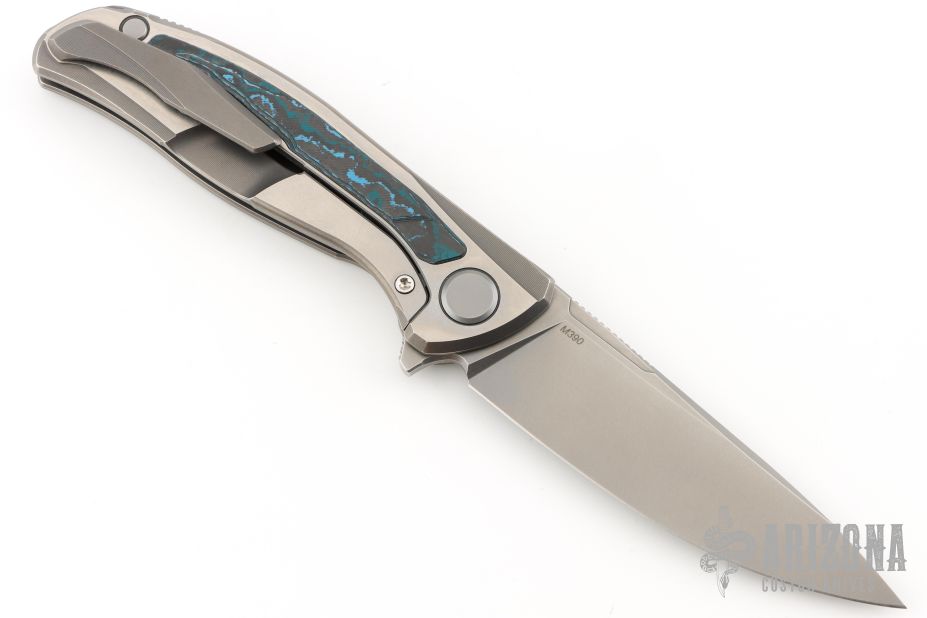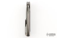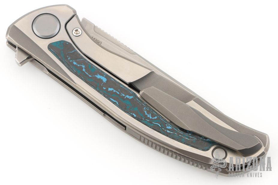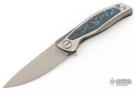 This F95R NL framelock flipper from Shirogorov has a flat ground tumble finished blade with notched thumbrest and flipper. The handle has a tumbled and milled titanium frame with Arctic Storm carbon fiber inlays, matching titanium backspacer, tip up titanium clip with hidden screws. Excellent lockup, crisp detent, and perfect seating. MRBS. Knife comes with original box and COA. Excellent condition.