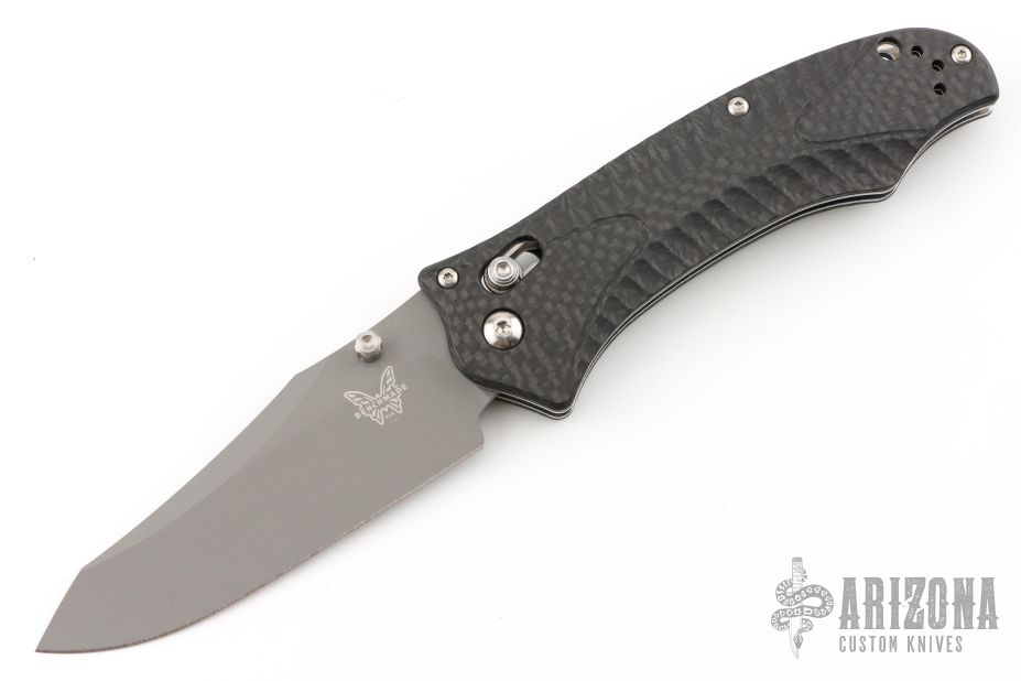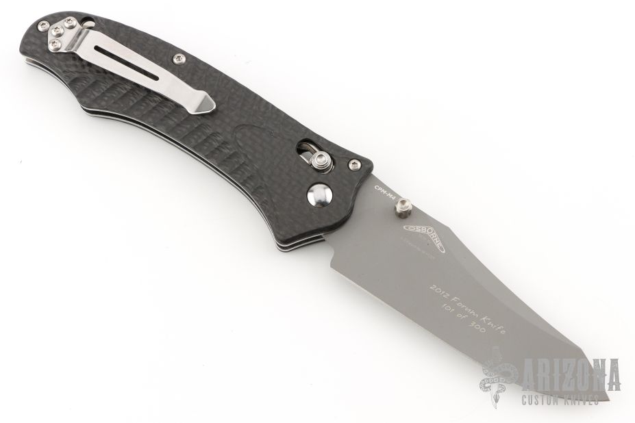 This Osborne designed Rift by Benchmade is from a limited run of 300 knives. Sculpted carbon fiber scales over stainless steel liners. Cerakote blade. Numbered 101 of 300 on back of blade. Includes original packaging and paperwork. 2012 Forum Knife. Excellent condition. Comes with original box and papers.