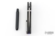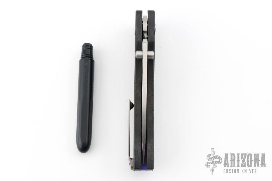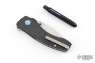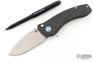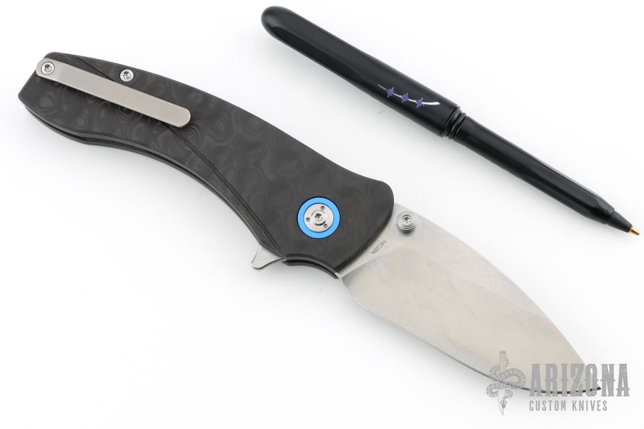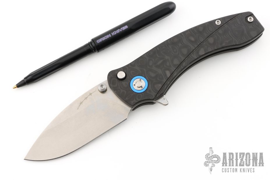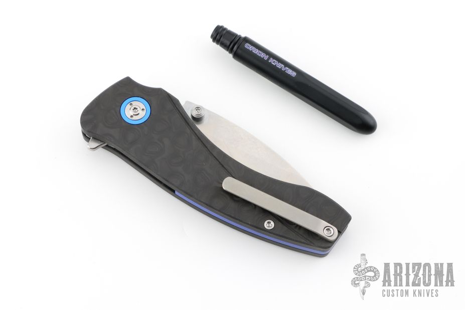 This Solaris by Orion Knives features a stonewashed blade with dual thumbstuds and a flipper. The handle has carbon fiber scales, blue pivot collars and backspacer, tip up reversible titanium clip. Comes with original box, papers and ink pen. Excellent condition.
