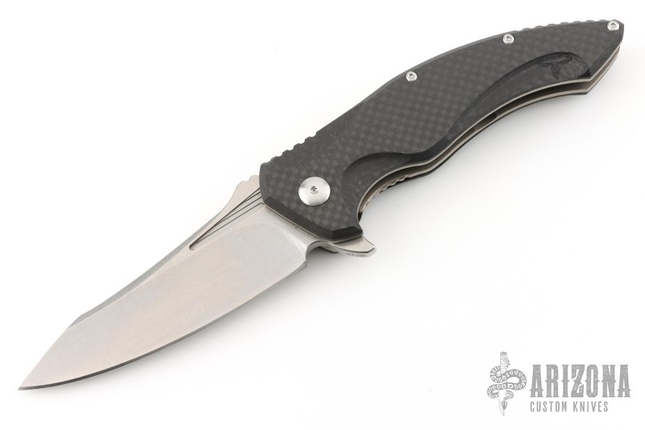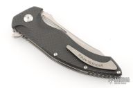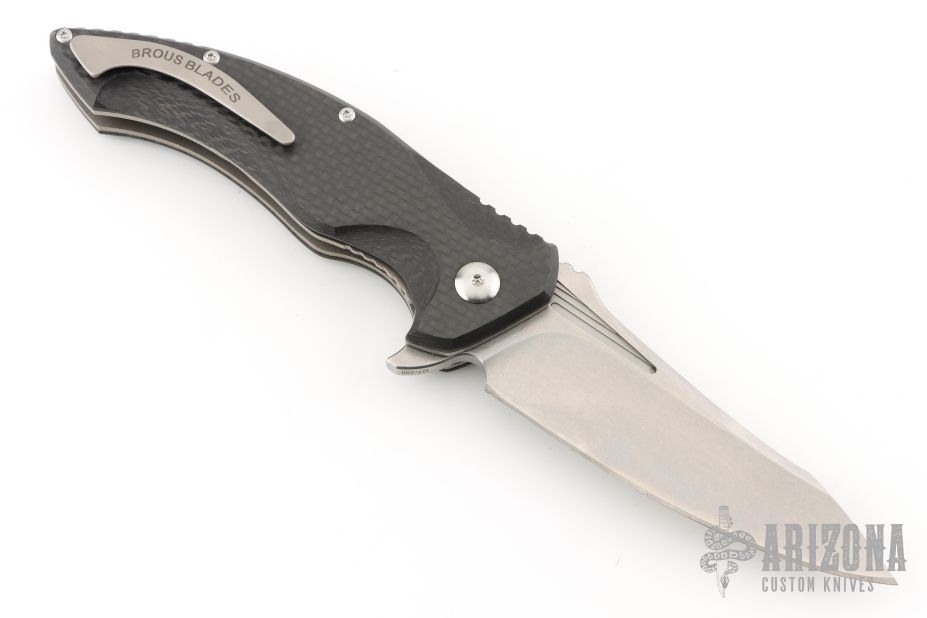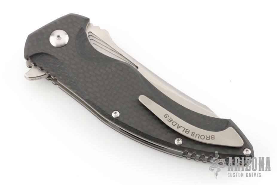 This T4 from Brous Blades features a stonewash finished blade with notched thumbrest and flipper. The handle has milled and sculpted carbon fiber scales, satin hardware and stainless steel liners and tip up clip, black G-10 backspacer. Comes with original box and COA. Excellent condition.