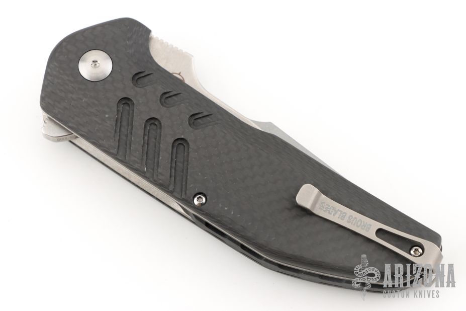 "Jason Brous began his efforts in knifemaking with the benefit of nearly 10 years of experience in CNC machining. His father owns a shop that specializes in the custom machining of high-precision components, mainly for the medical industry. Jason spent a lot of time in his father’s shop while growing up, and by his mid teens was actively helping out with production. His skills and knowledge steadily increased and by the time he was 20 he was a seasoned and very competent machinist. Jason's interest in knives actually began with art - specifically a style called “Bio-mechanical” - as practiced by one of his favorite artists, a Brazilian painter and tattooist named Lango. Biomechanical art (also called Biomech) is a surrealistic style of art that combines elements of machines and robotics with organic animal features. Intrigued by this style of art and its similarity to many fantasy knives, Jason figured that knifemaking would be a natural extension of his metalworking skills and an appropriate medium for his artistic ideas. Although he had no specific training in knifemaking, in 2010 he designed and made his first knife - a fantasy design with a Biomech flavor. Through persistent trial and error, Jason changed his style of knife design to focus on functional simplicity, while still maintaining a strong artistic signature. His early successes came in the form of a series of stout neck knives with dual finger-hole grips. Fans of these “Silent Soldier” neck knives began asking for other expressions of the design. Since then, Jason has created numerous variations including a clip point version, a tanto version and the very popular folder version called the Silent Soldier Flipper."