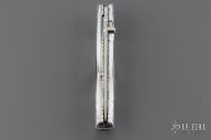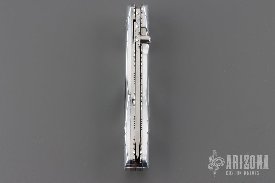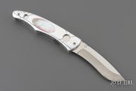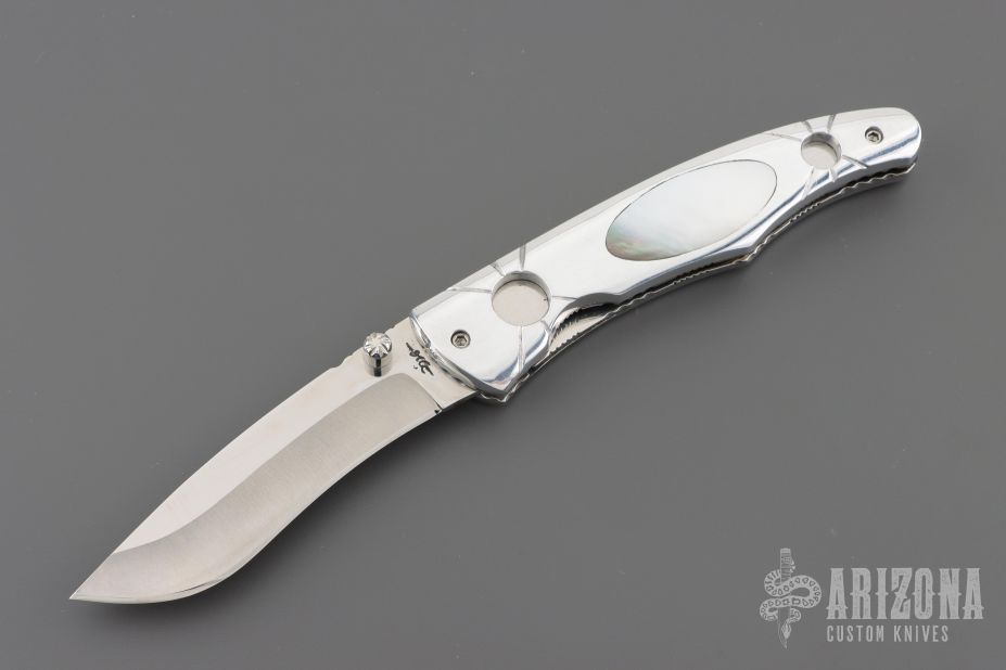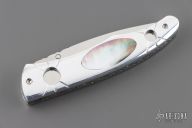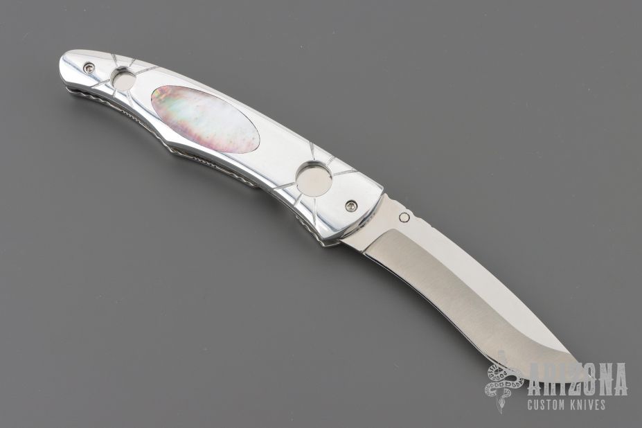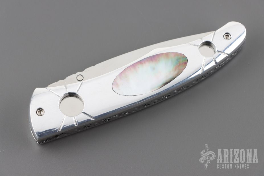 This knife by DC Customs features a mirror polished blade with a single thumbstud with and fileworked blade spine. The handle has fluted aluminum scales with mother of pearl inlays, fileworked stainless steel liners and backspacer. Nice detent, lockup and blade seating. Has some light scratches, otherwise excellent condition.