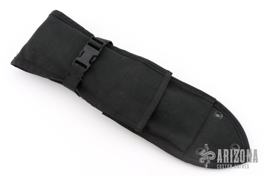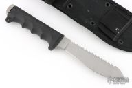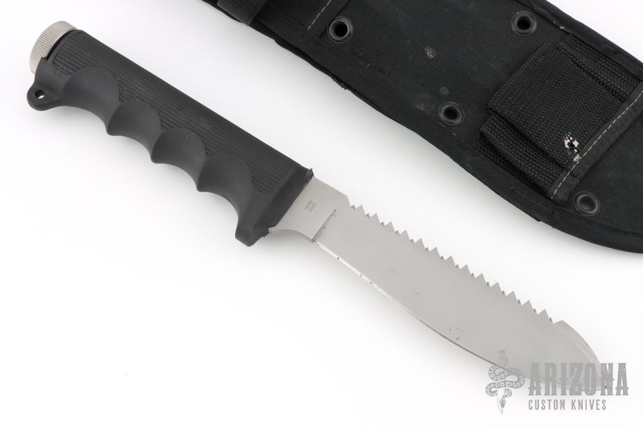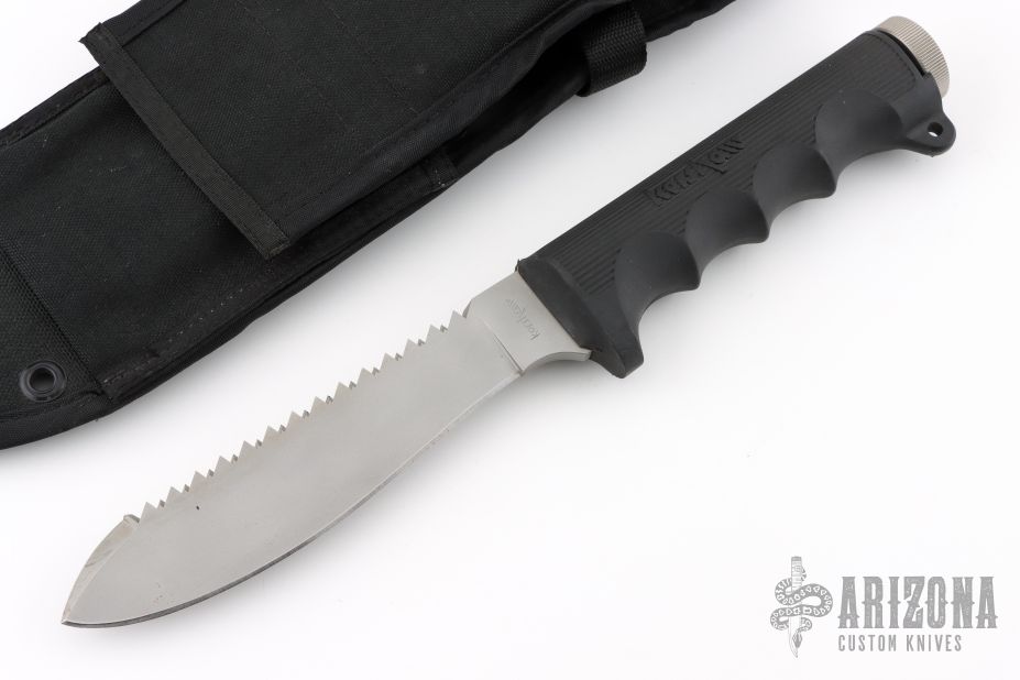 This Survival Knife by Kershaw features a bead blasted blade with sawteeth on the spine, .233" blade stock and 1.432" blade depth, hidden tang construction. The handle has a rubber grip with hollow handle with stainless steel removable butt cap. Comes with nylon/plastic/velcro Kershaw flap sheath with plastic buckle. Has some light scuffs, otherwise excellent condition. Discontinued in 1988.