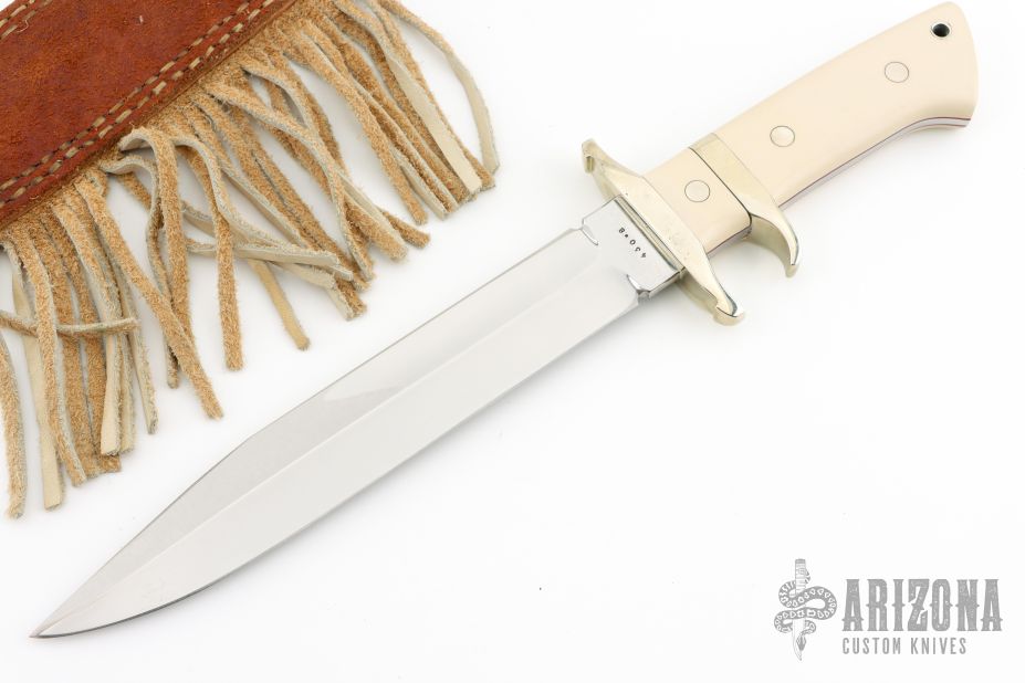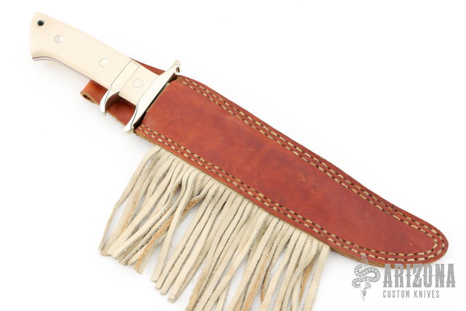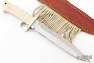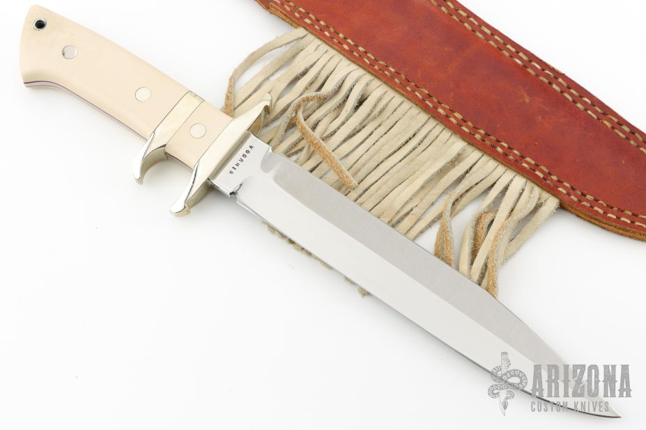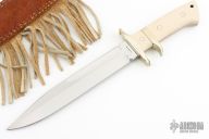 This Sub Hilt Fighter from Steve Voorhis features a mirror polished clip point blade with sharpened top edge, .222" blade stock and 1.371" blade depth, full tapered tang construction. The handle is comprised of a nickel silver guard and sub hilt, ivory paper micarta scales over red liners. Comes with brown leather sheath. Excellent condition. #430-8