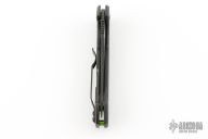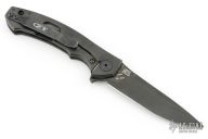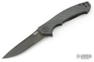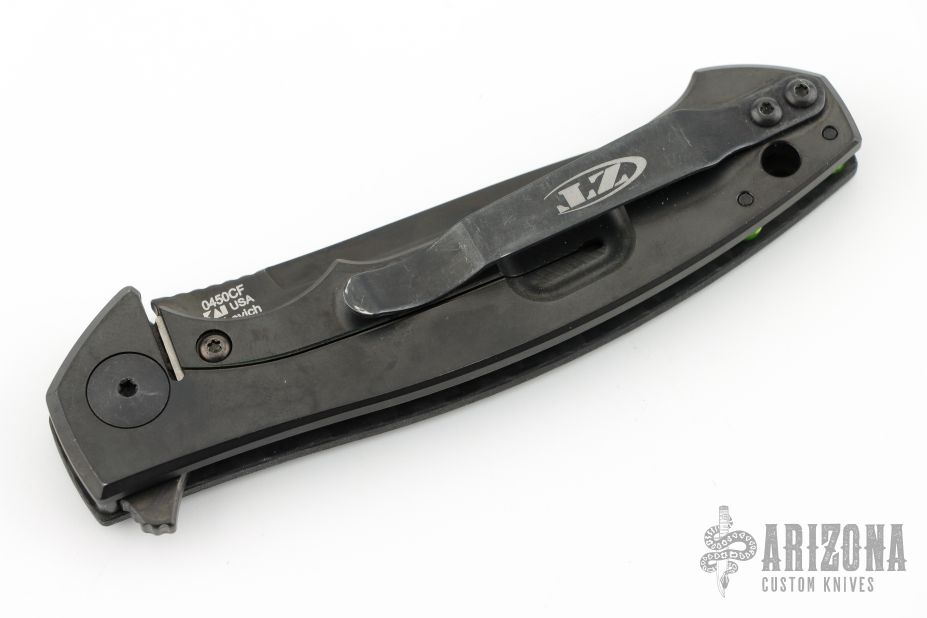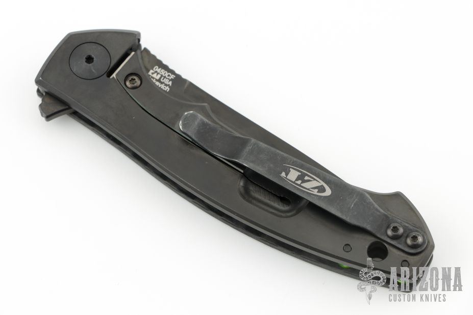The Dmitry Sinkevich designed ZT 0450CF knife is a compact version of the award-winning 0454 folder. It has an S35VN stainless steel blade with a black DLC finish. A flipper and the KVT ball-bearing pivot produce reliable, quick one-hand deployment. The titanium handle has a sturdy frame lock and a stylish carbon fiber scale that contrasts nicely with the black blade. A reversible tip-up carry pocket clip rounds out the package.  S/N 2344. Has a couple light scuffs, great condition otherwise.