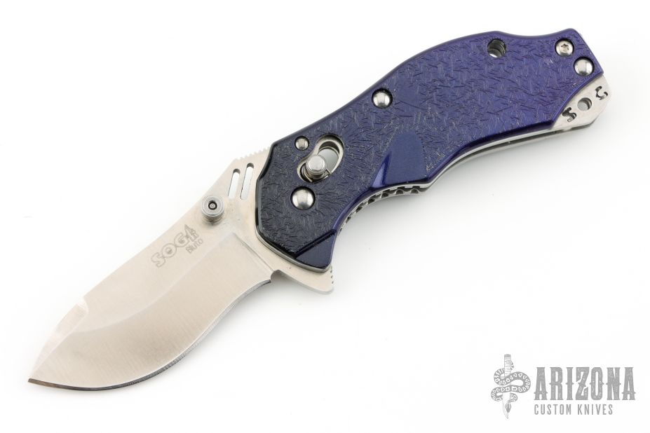 Maker statement: "The muscular stance and bulging form belay a quiet confidence. This little guy has its own point of view and the strength to back it up. With a very innovative textured machined aluminum handle, the Bluto handles well. Its VG-10 blade, Arc-lock and hardened scalloped steel liners make a rock solid package. The sweeping blade style is modern and functional and unique to the SOG line. Flex a new look with the Bluto. "