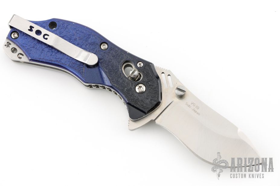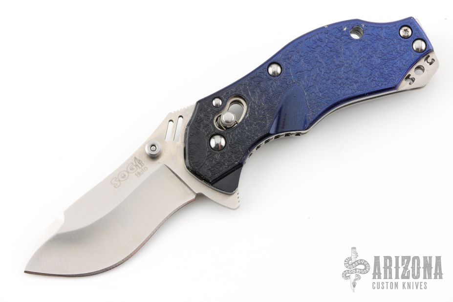 Maker statement: "The muscular stance and bulging form belay a quiet confidence. This little guy has its own point of view and the strength to back it up. With a very innovative textured machined aluminum handle, the Bluto handles well. Its VG-10 blade, Arc-lock and hardened scalloped steel liners make a rock solid package. The sweeping blade style is modern and functional and unique to the SOG line. Flex a new look with the Bluto. "