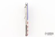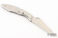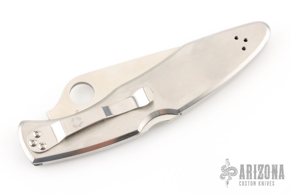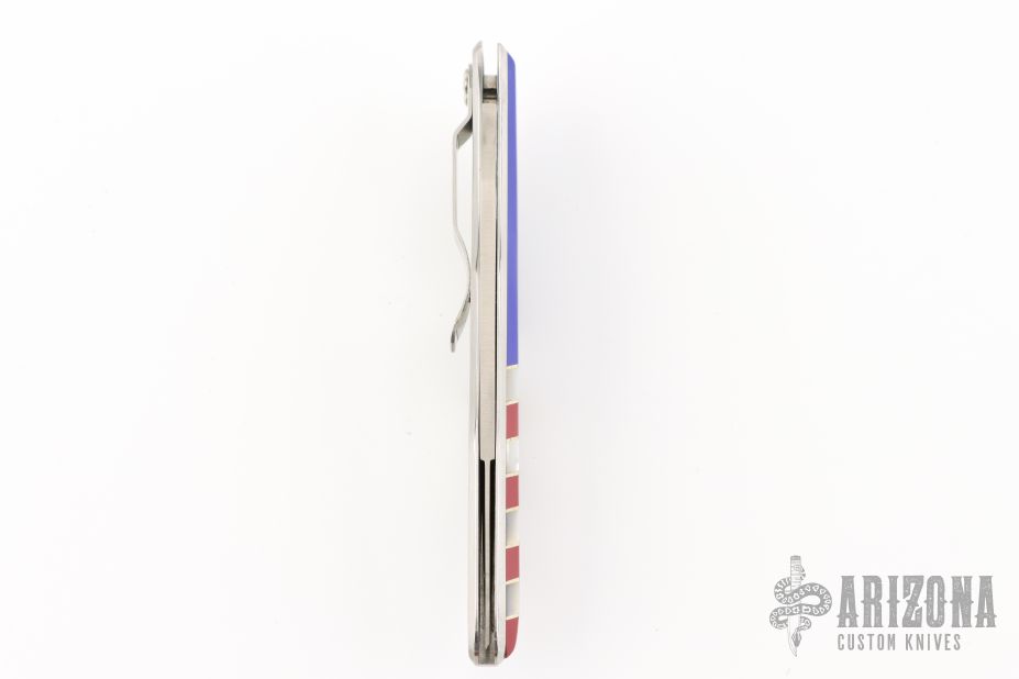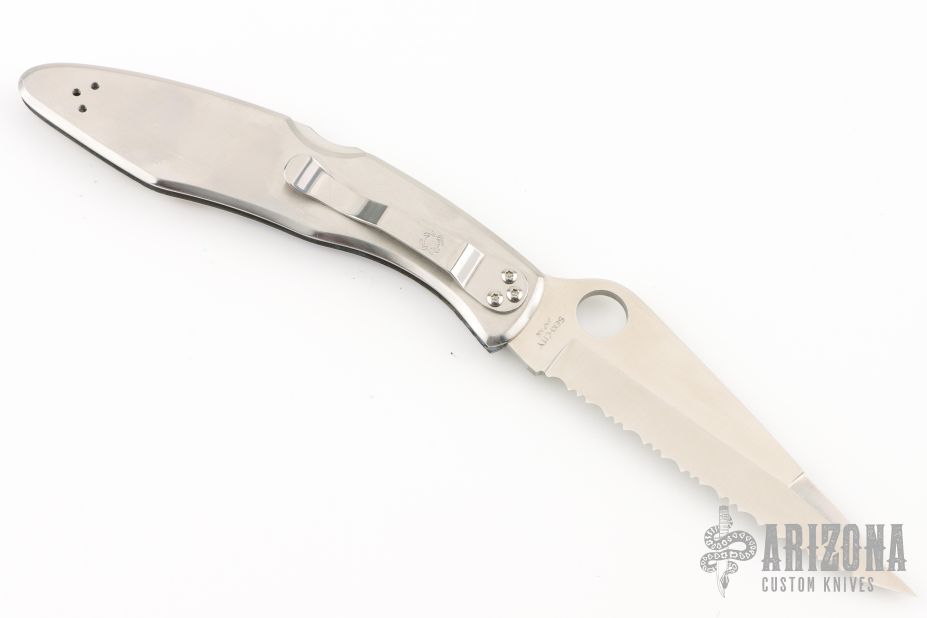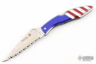 This Police knife by Spyderco features satin finished blade with a thumbhole and fully serrated edge. The handle is stainless steel with Blue/Red/Pearl overlay. Has a tip down stainless steel clip. Comes with a Spyderco box. Has some scratches, excellent condition otherwise.