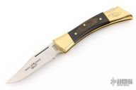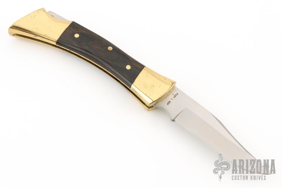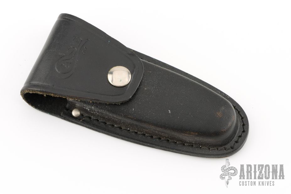 This lockback folder features a satin finished clip point blade with nail nick. The handle has brass bolsters, front and rear, brass liners, and wood scales. Comes with original box, papers and black leather sheath. Has some light scratches and patina, otherwise good condition.