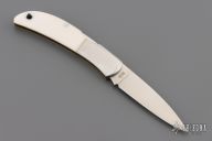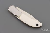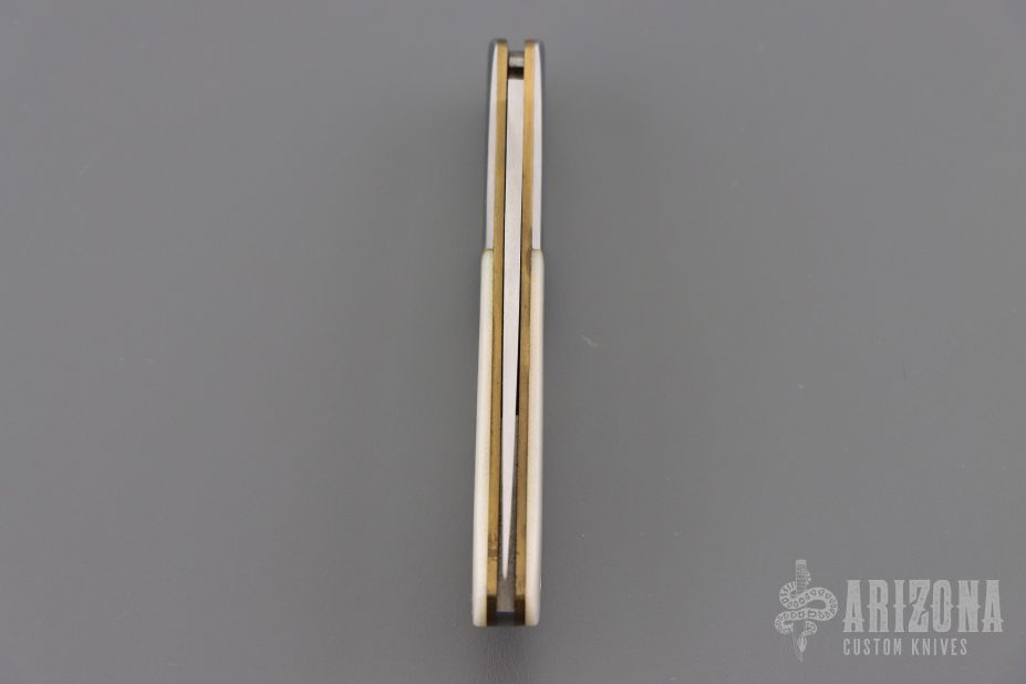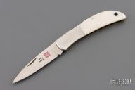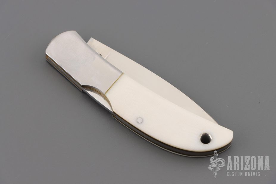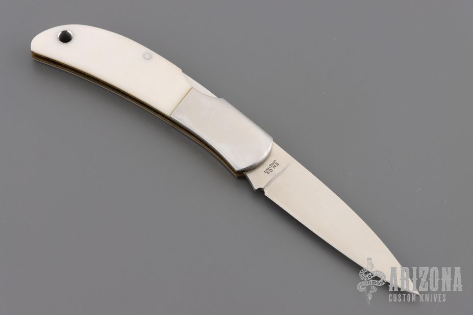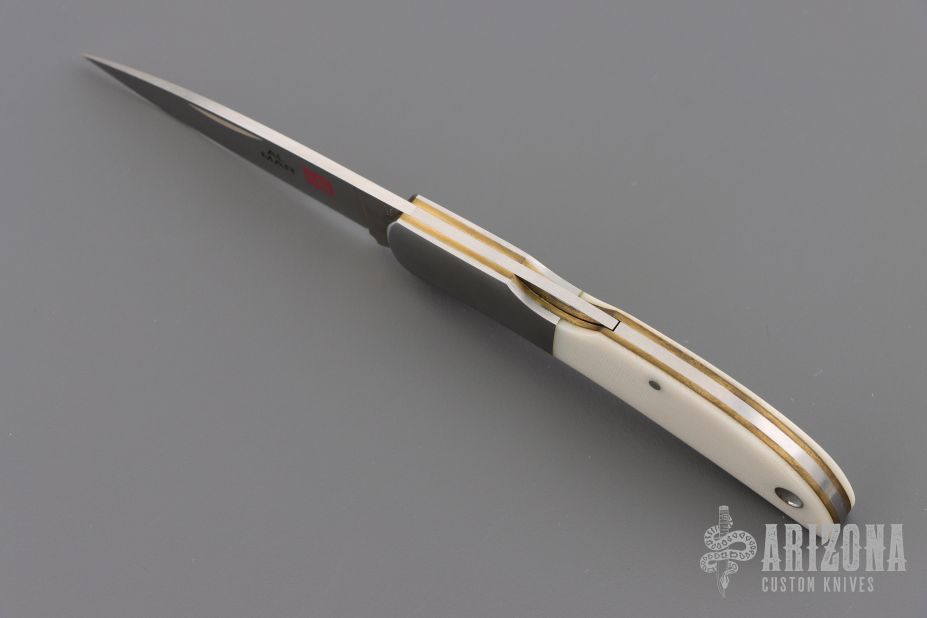 This knife by Al Mar features a satin finished blade with nail nick. The handle has stainless steel bolsters, white G10 scales, brass liners, and a stainless steel backspacer. Comes with leather slip. Has some light scratches. Excellent condition.
