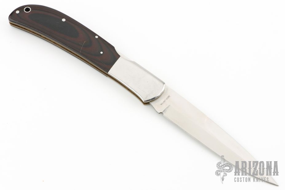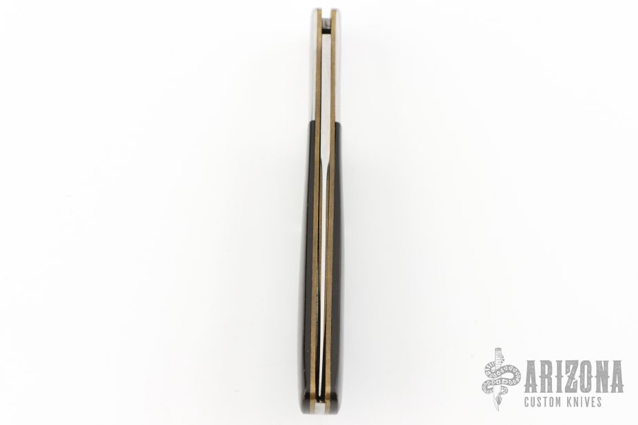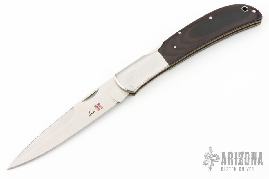 This lock back by Al Mar Knives has a satin finish blade with false top edge and a nail nick. The handle has stainless steel bolsters, black/brown paper micarta scales, brass liners. Strong lock up. A few light scratches on bolsters and blade otherwise great condition.