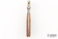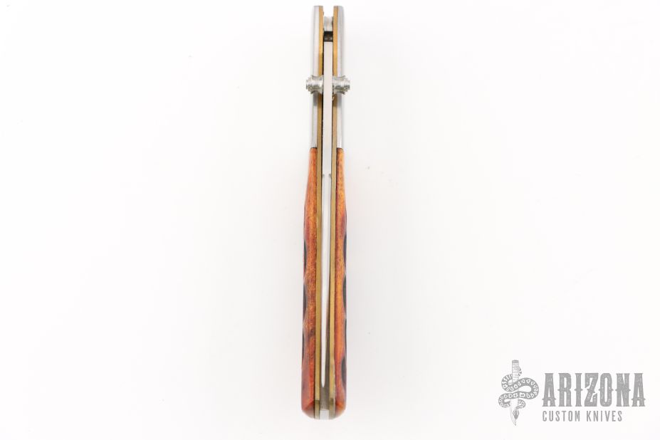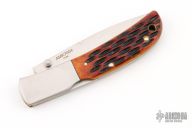 This Falcon by Al Mar features a satin finished blade with false top edge and dual thumbstuds. The handle has stainless steel boslters, jigged bone scales, brass liners, stainless steel backspacer. Comes with original brown leather slip sheath. Has a couple light scratches excellent condition otherwise.