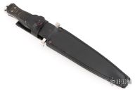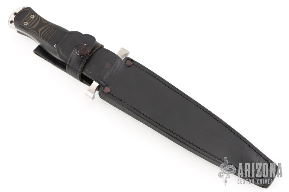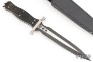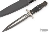 This Dagger by Boker Magnum is a Pohl Force design, it features a satin and black coated double edged blade, 3/16" blade stock and 1 1/4" blade depth, full tang construction. The handle has stainless steel guard and black/white micarta scales. Comes with black leather sheath. Has some light scratches, otherwise excellent condition.