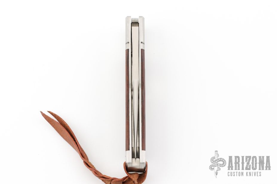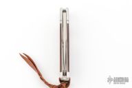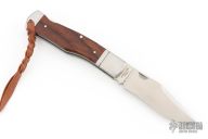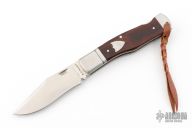 This lockback by AG Russell features a satin finished blade with false top edge and nail nick. The handle has fluted stainless steel bolsters, wood covers, stainless steel liners and backspacer. Has lanyard hole and lanyard attached. Has some scuffs and scratches, great condition otherwise.