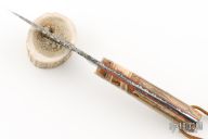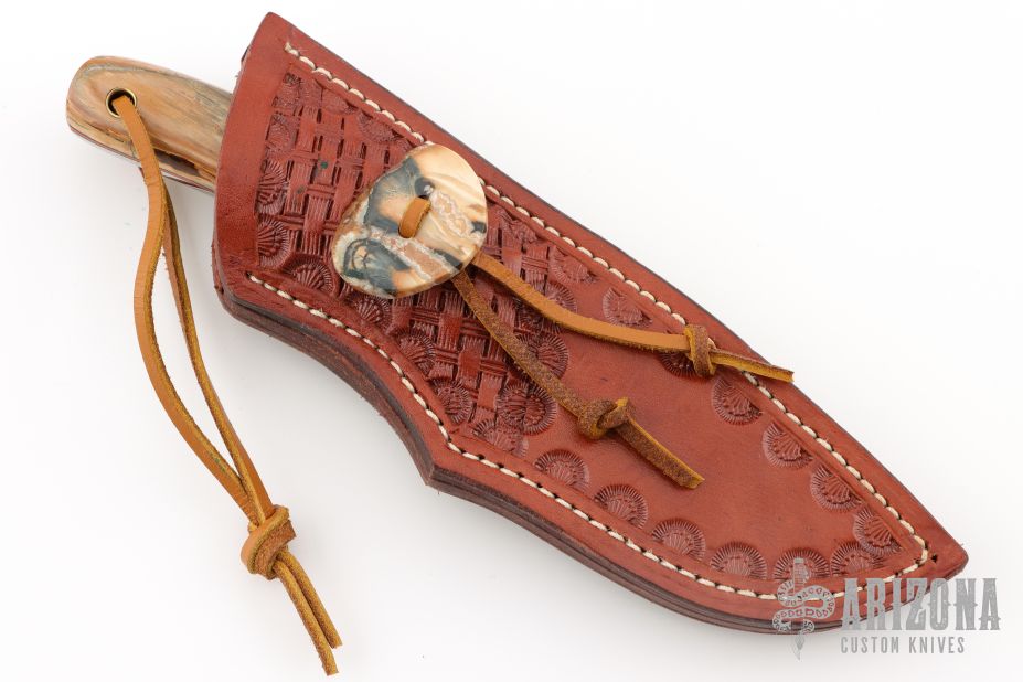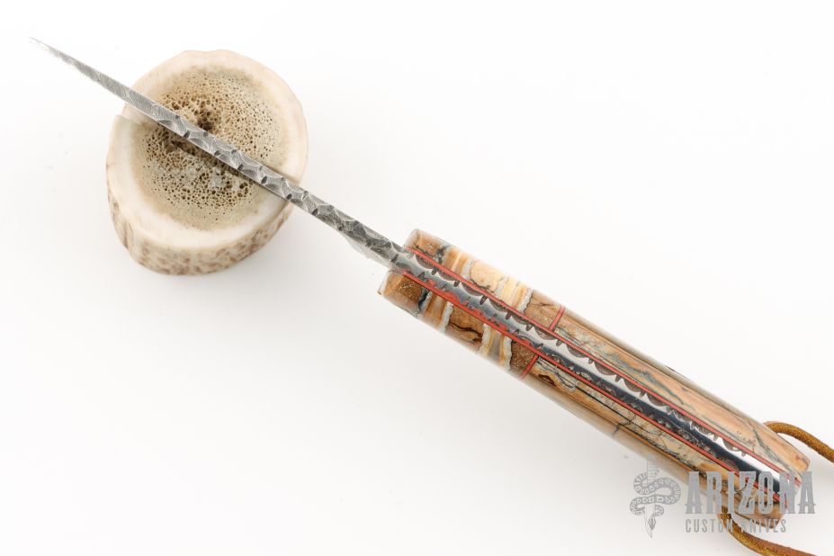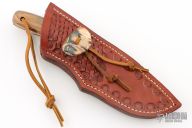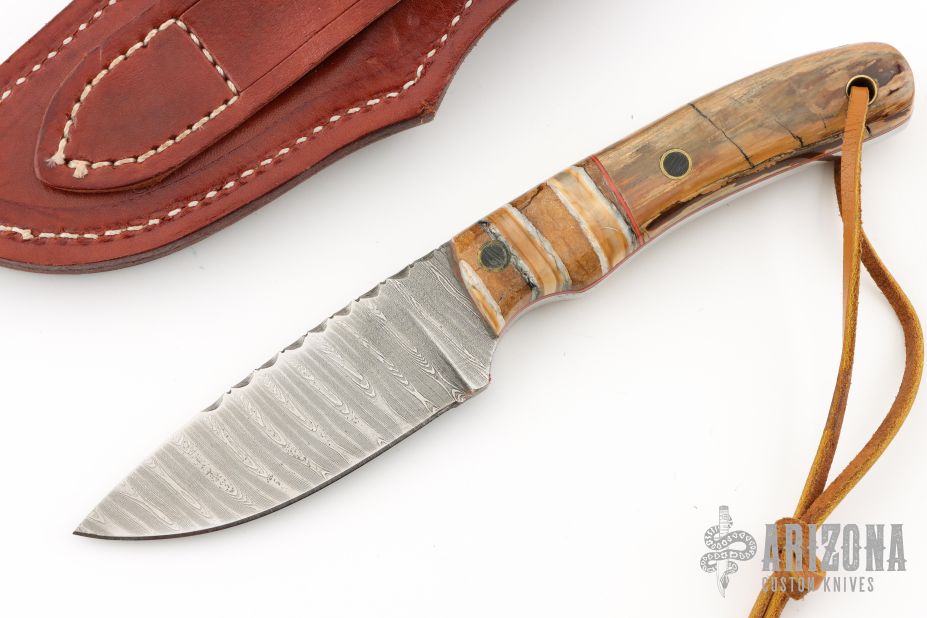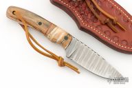 This hunter by RA Matt features a Damascus blade with fileworked spine, .158" blade thickness and 1.189" blade depth, full tang construction. The handle has mammoth tooth bolsters, mammoth ivory scales with black/brass pins and red liners, fileworked tang spine. Comes with a hand tooled brown leather sheath. Excellent condition.