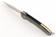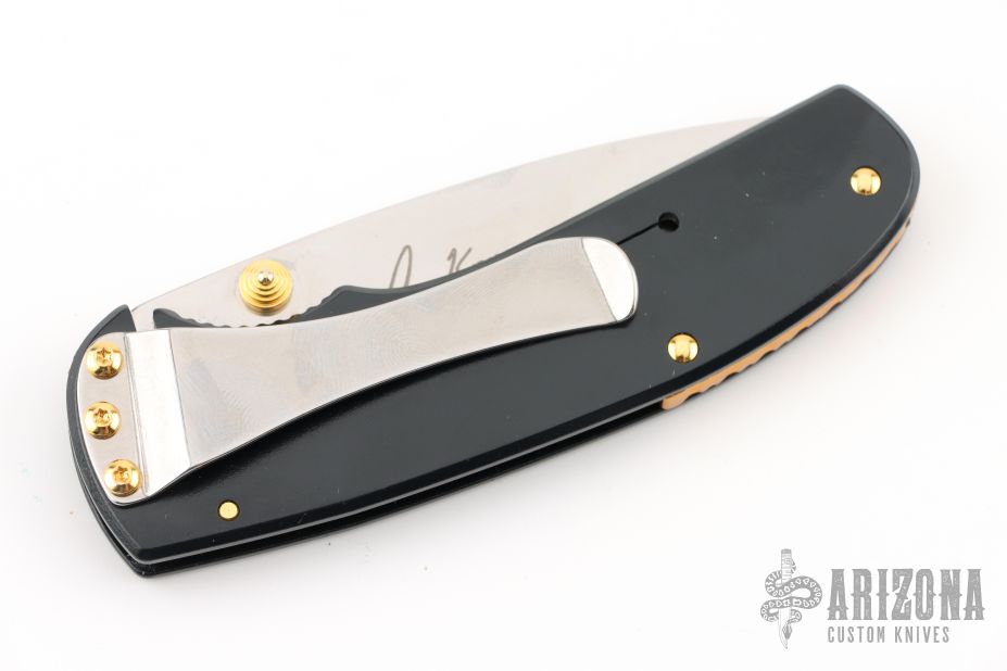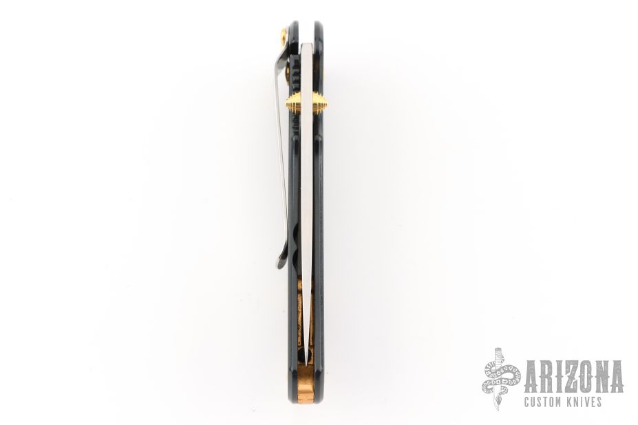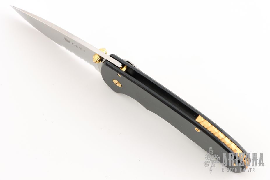 This Full Throttle from CRKT features a mirror polished drop point blade with dual gold anodized thumb studs. The handle is comprised of a black coated stainless steel frame over fileworked and gold anodized backspacer with matching hardware. Polished stainless steel tip up clip. Fast and strong assisted opening. Includes original box and paperwork. Excellent condition.