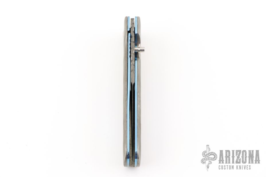 This linerlock folder by Joe Pardue features a Damascus blade with fileworked spine and single thumbstud. The handle has Damascus scales with abalone inlays, anodized and jeweled titanium liners, and a fileworked and anodized titanium backspacer. Nice detent, lock up and blade seating. Excellent condition. Comes with a zippered case.