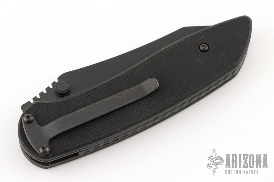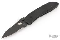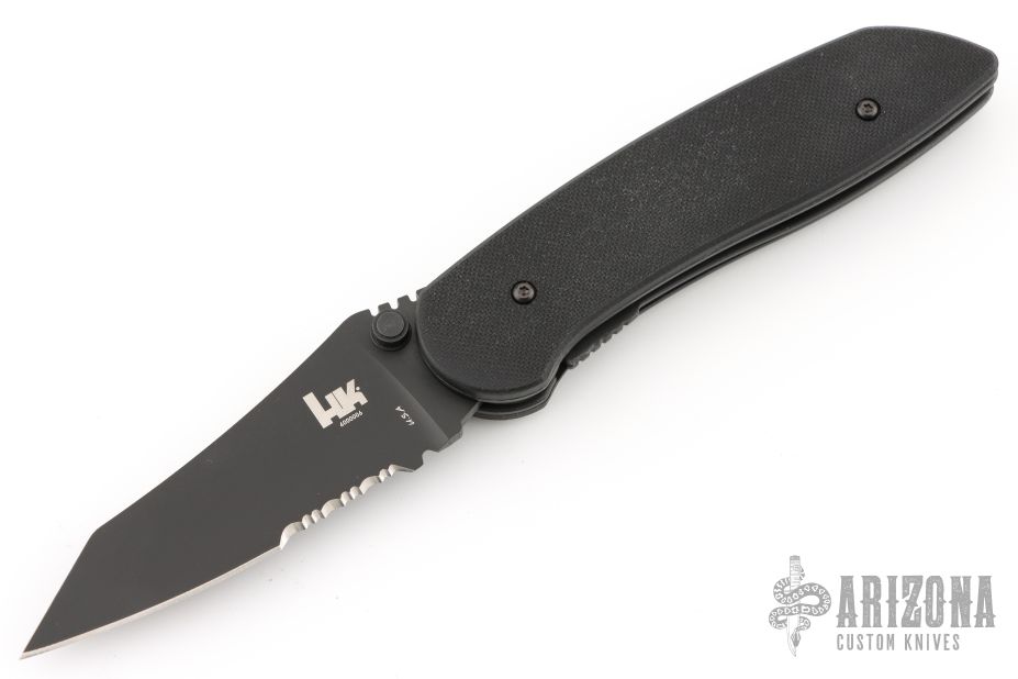 The H&K Scorch Code 3 features a unique dual-action design. The black blade is D2 tool steel with a reverse tanto design with notched thumbrest and dual thumbstuds. The handle is textured black G-10 with black stainless steel liners and tip down clip. Excellent condition. Comes with original box and papers.