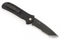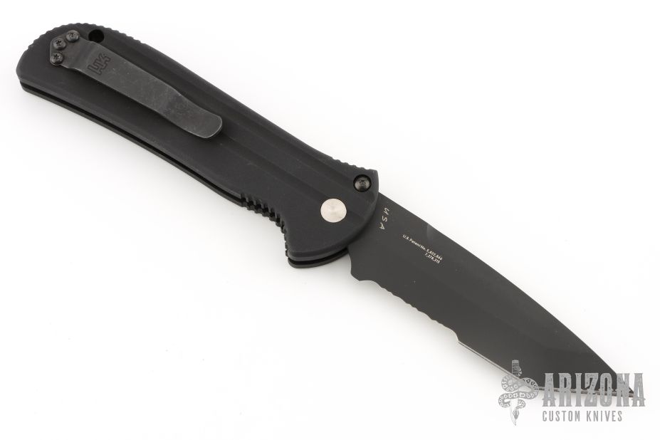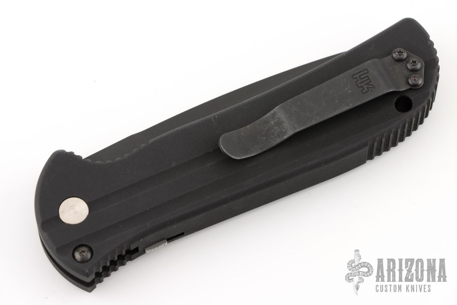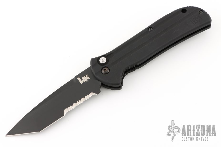 This Entourage auto by Heckler and Koch features a black tanto blade with wear on the finish. The handle has a black aluminum frame with tip up black stainless steel clip. Has safety. Excellent condition.
