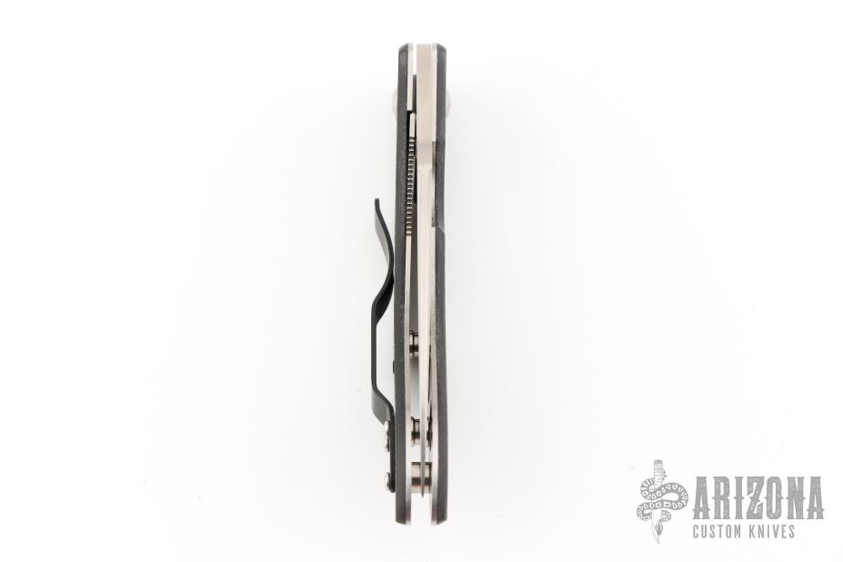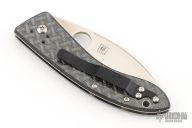 This Lum Chinese folder from Spyderco has a satin finished blade with thumbhole and false top edge. The handle has carbon fiber scales, stainless steel liners, and a black up or down reversible stainless steel clip. Comes with original box and papers. Has a couple light scuffs, otherwise excellent condition.