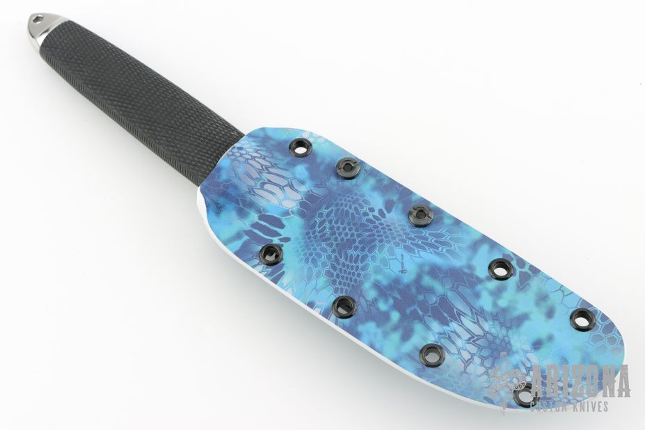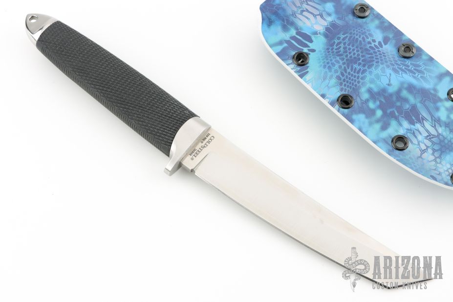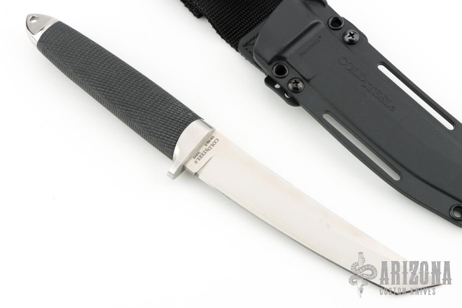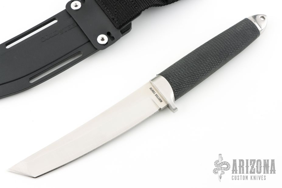 This Master Tanto by Cold Steel features a satin finished San Mai tanto blade with .187" blade stock and 1.121" blade depth, hidden tang construction. Guard and pommel are stainless with a textured Kraton grip. Comes with original box, black Secure-Ex sheath and custom Kydex sheath. Excellent condition.
