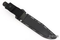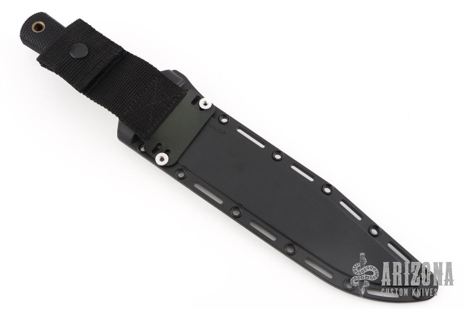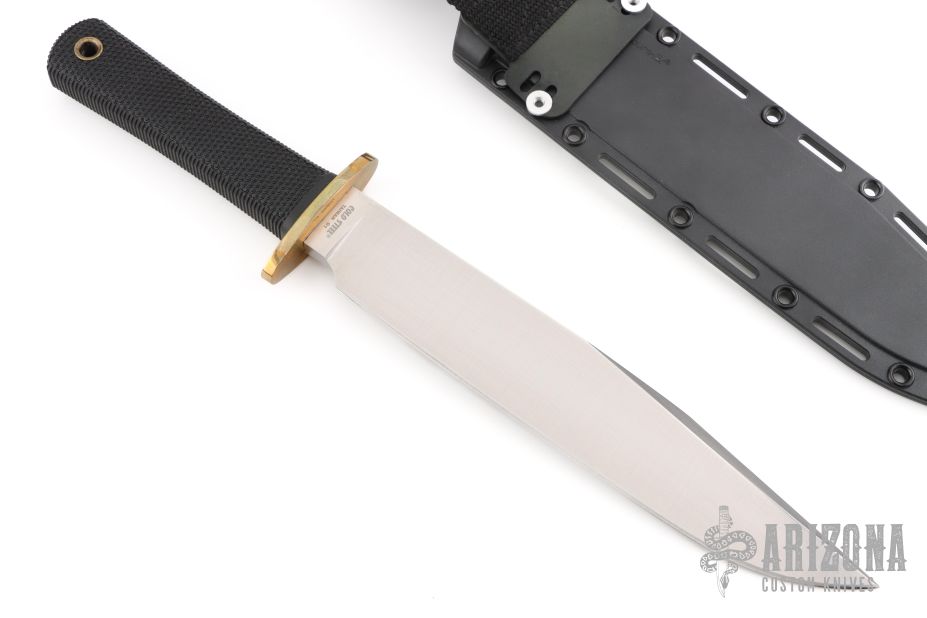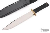 This Trail Master bowie by Cold Steel features a satin finished clip point blade with a sharpened top edge, .304" blade stock and 1.595" blade depth, hidden tang construction. The handle has a brass guard and a rubber handle. Has a couple light scratches, otherwise excellent condition. Includes original SecurEx sheath and a custom kydex sheath.