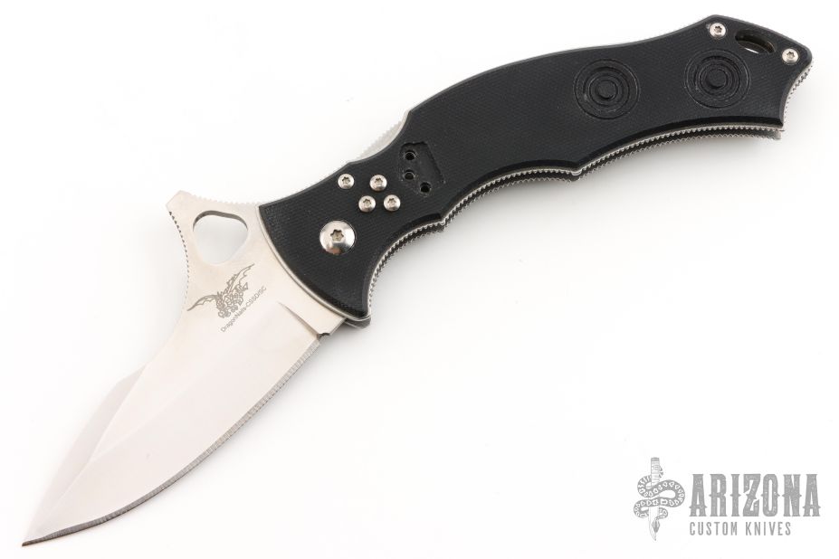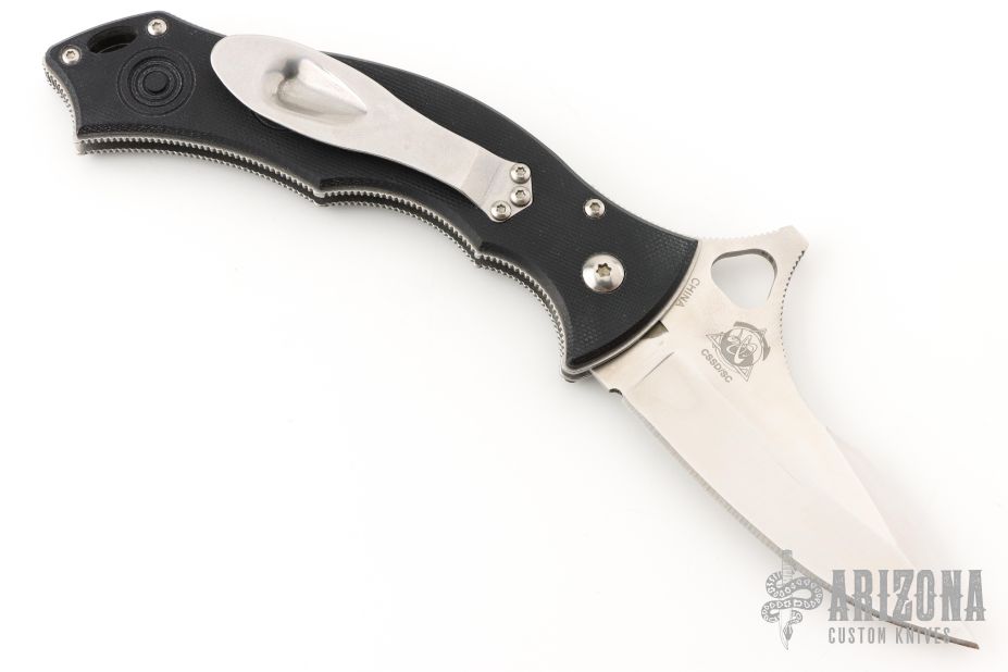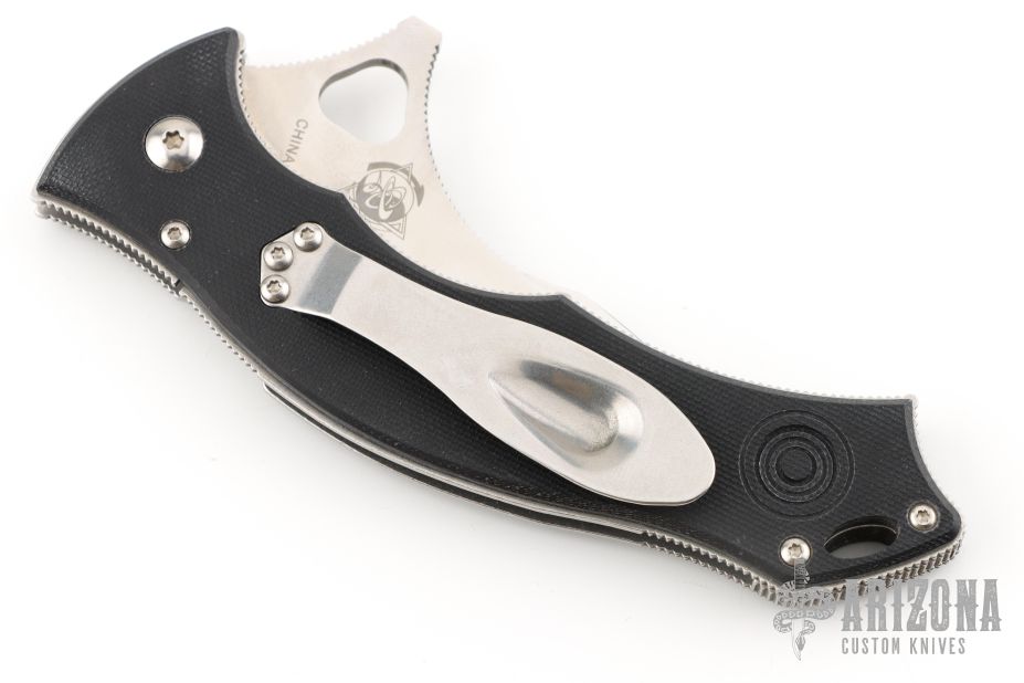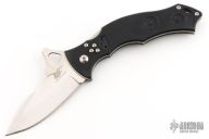 This Lapu Lapu knife by Braun Frank features a satin finished blade with notched thumbrest and thumbhole. The handle has black G-10 scales, stainless steel liners and a tip down clip. Excellent condition.