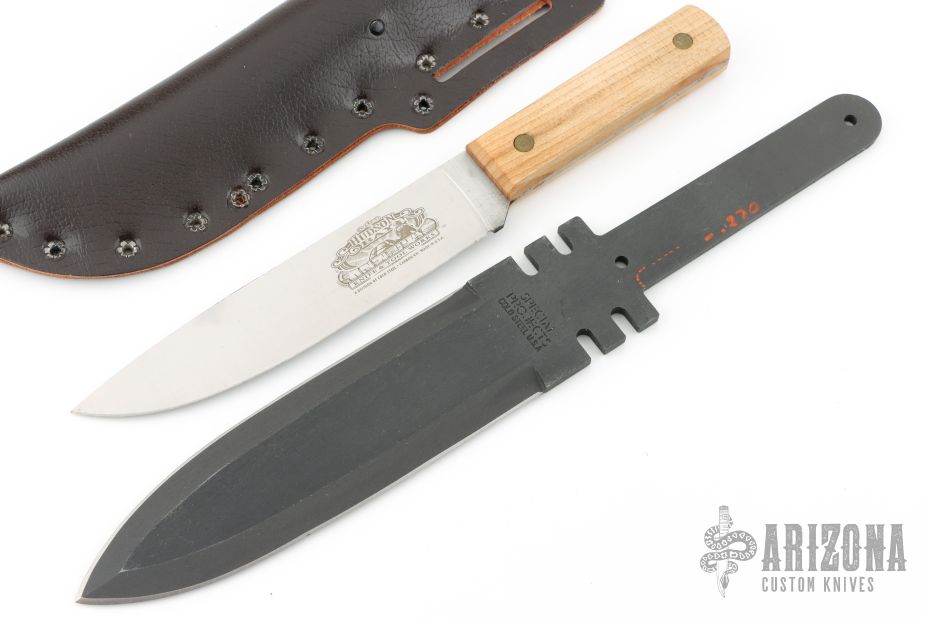 Satin finished drop point blade with pinned wood covers. .125" blade stock and 1.391"blade depth. Comes with original leather sheath. 7" Blade, 12.625" Overall. Has some patina, otherwise Excellent condition.