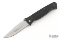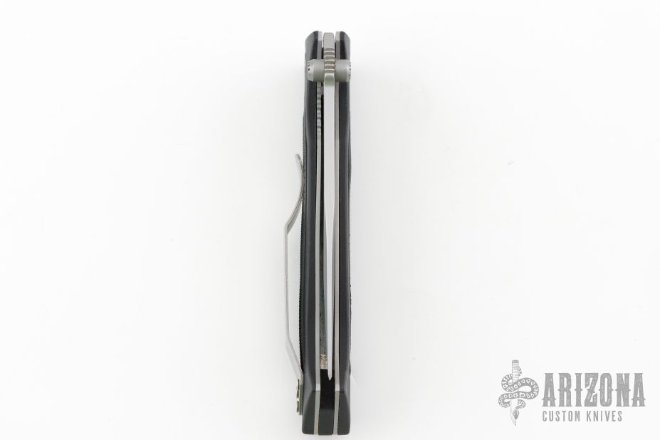 This Vallotton Chameleon D/A by Timberline Knives has a bead blasted blade with dual thumb studs and notched thumbrest. Handle is black FRN composite scales with rubber inlay, stainless steel liners and tip up clip. Has some light scratches, the blade doesn't sit all the way down in the handle when closed, otherwise good condition. The hidden button is under the front rubber scale.