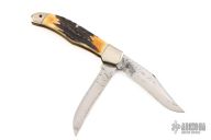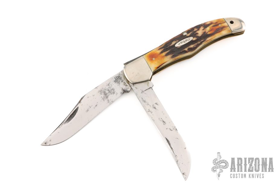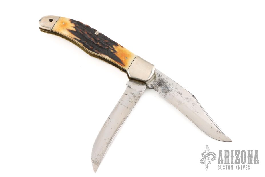 This Trapper from Ka-Bar features polished blades with nail nicks. The handle has nickel silver bolsters and pommel with stag covers over brass liners and steel springs. Comes with original box. Has some scratches, Has been sharpened, otherwise good condition for its age.