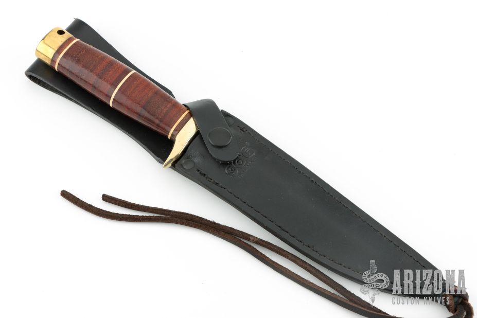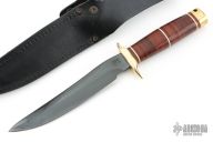 This SBR-80 Recon Bowie has a blued blade with hidden tang and brass double guard. Blade width is 1/4", depth 1-3/16". Handle is stacked leather with white spacers, brass double guard, and brass butt cap with lanyard hole. Comes with a black leather sheath. Excellent condition.