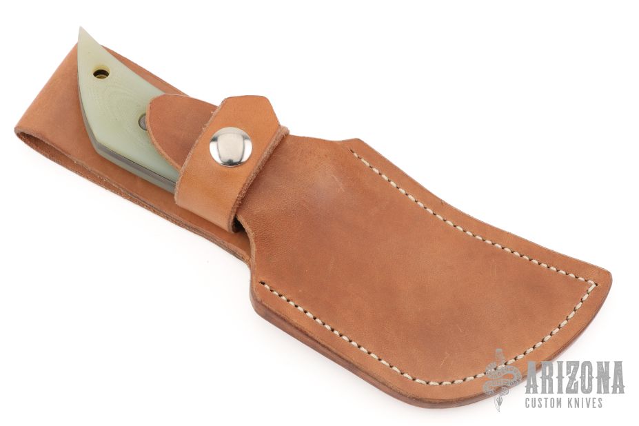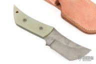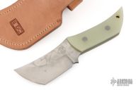 This Phatty Hinto by Cobalt Customs features a hand rub satin finished blade with hamon, .176" blade stock and 1.865" blade depth, full tang construction. The handle has jade G-10 scales. Comes with a brown leather sheath. Excellent condition. Comes with COA dated 2-22-15