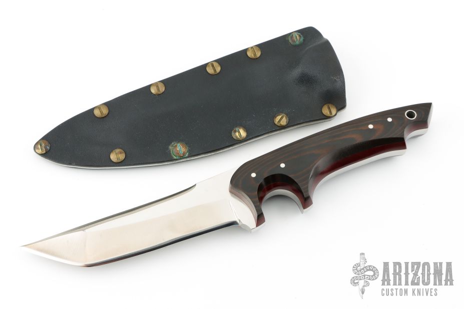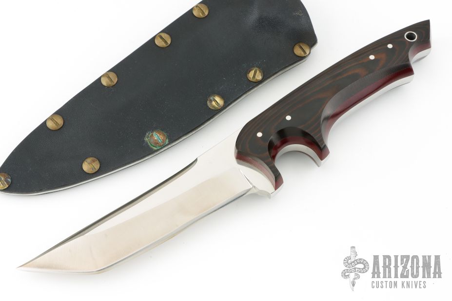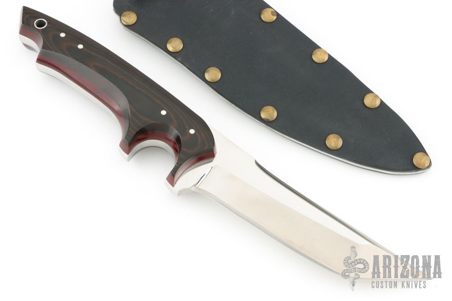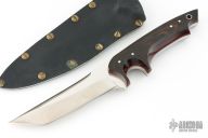 This knife by Jon Schulps features a satin finished blade with mirror polished flats, false top edge, .314" blade stock and 1.493" blade depth, full tang construction. The handle has black/red linen micarta scales with stainless pins. Comes with a kydex sheath and a zippered case. Has some light scratches, otherwise excellent condition. Dated 1986