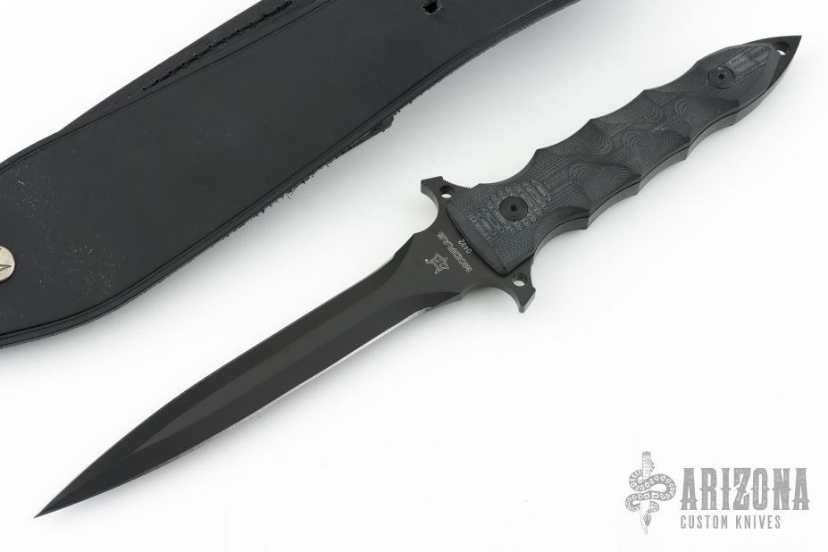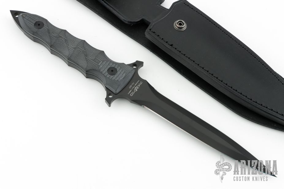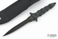 Designed for close quarters combat, the robust Fox Modras dagger features a Bohler N690Co stainless steel blade. The integrated hand guard not only protects your hand from coming into contact with foreign object but includes two lashing points for extra versatility. Contoured G-10 scales are comfortable in hand while providing an exceptional grip. Easily carry your Modras into the field with the MOLLY compatible leather sheath and black cord lanyard. Comes with original box, papers and black leather sheath. Excellent condition. #0492