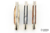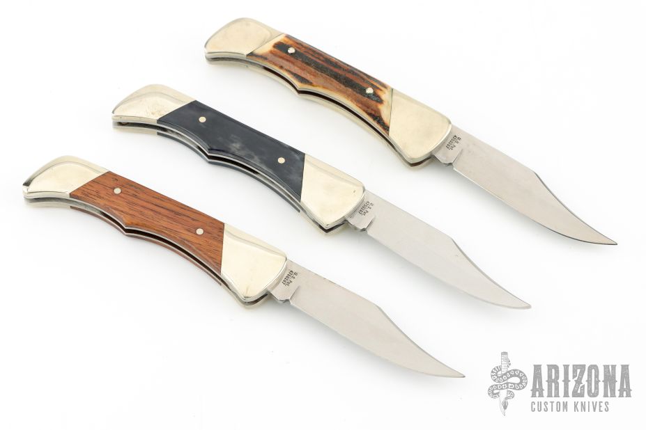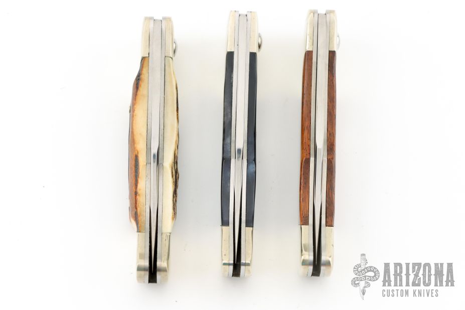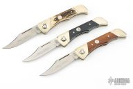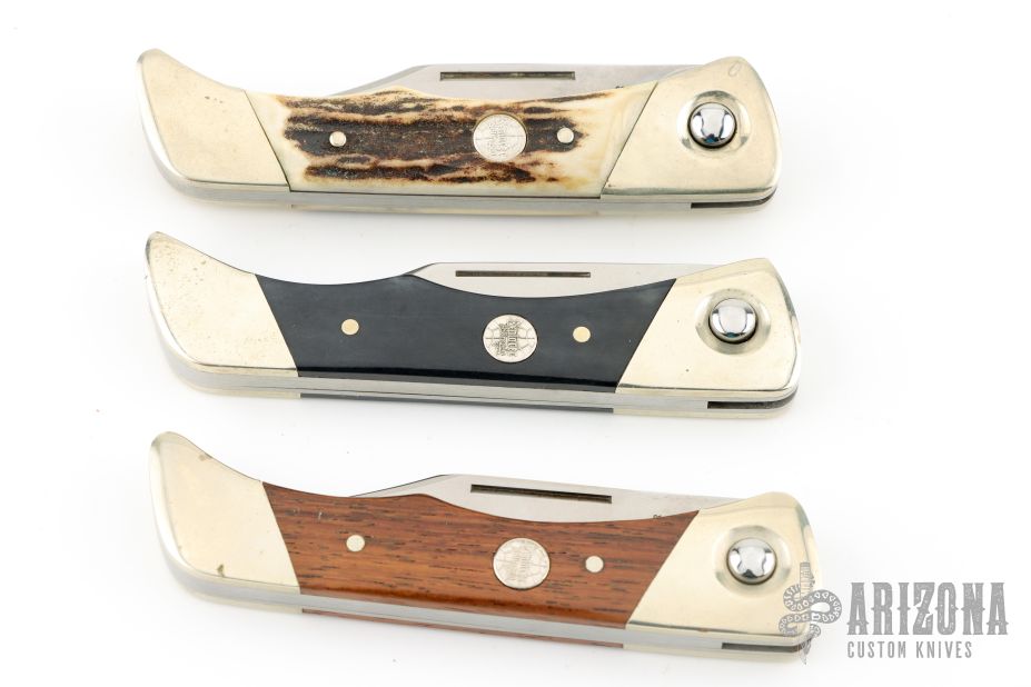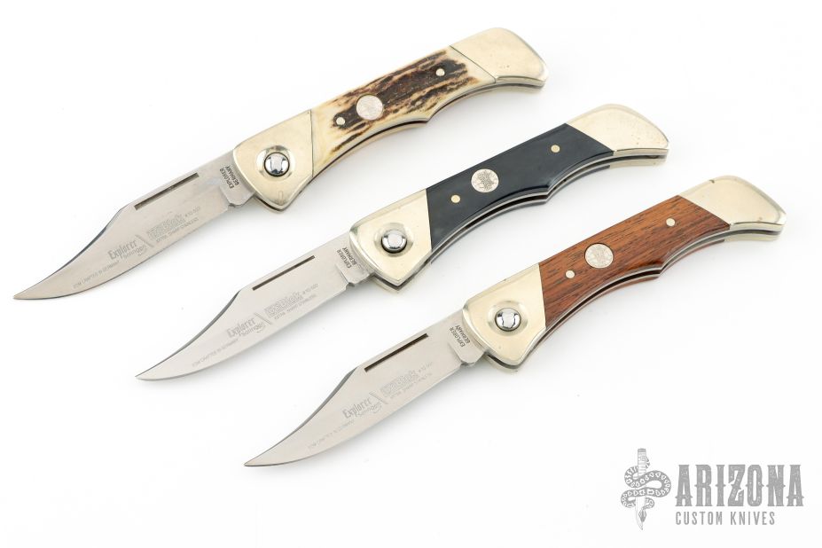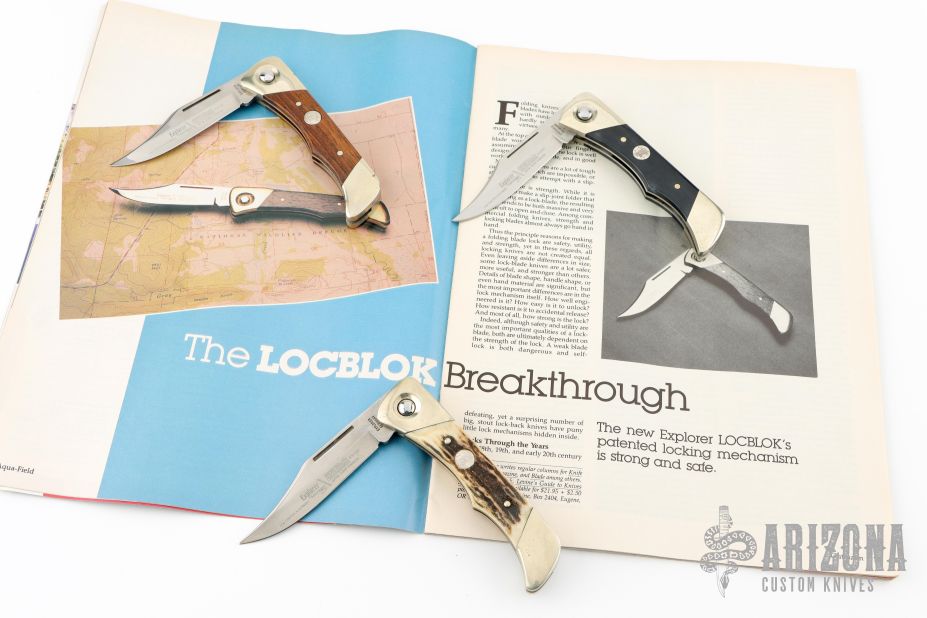This set of three LocBlok Folders by Explorer features mirror polished blades, nickel silver bolsters, dyed bone, wood and stag scales, stainless steel liners and backspacer. Has a half stop. Has some light scratches, otherwise excellent condition. Comes with an issue of Gumann Knives Magazine from 1992 where these knives are featured in an articale.
