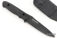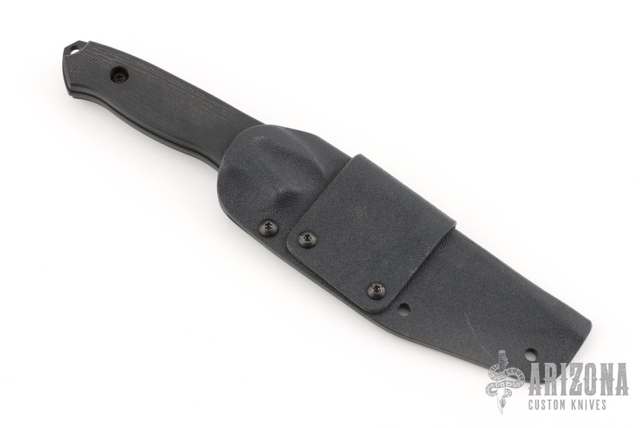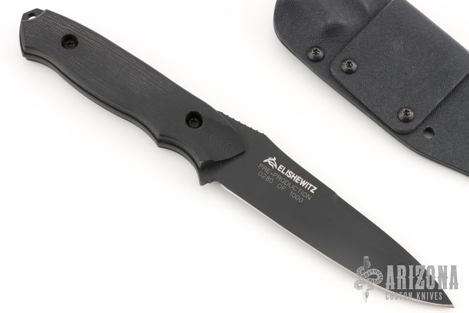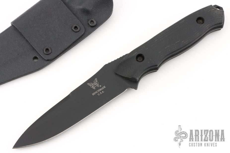 This Nimravus by Benchmade has a black blade with .139" blade stock and 1.274" blade depth, full tang construction with black G10 scales and lanyard hole. Interesting 2-piece Kydex belt sheath. Allen Elishewitz design. Pre-Production #0280of 1000. Has some light sheath scuffs, otherwise excellent condition.