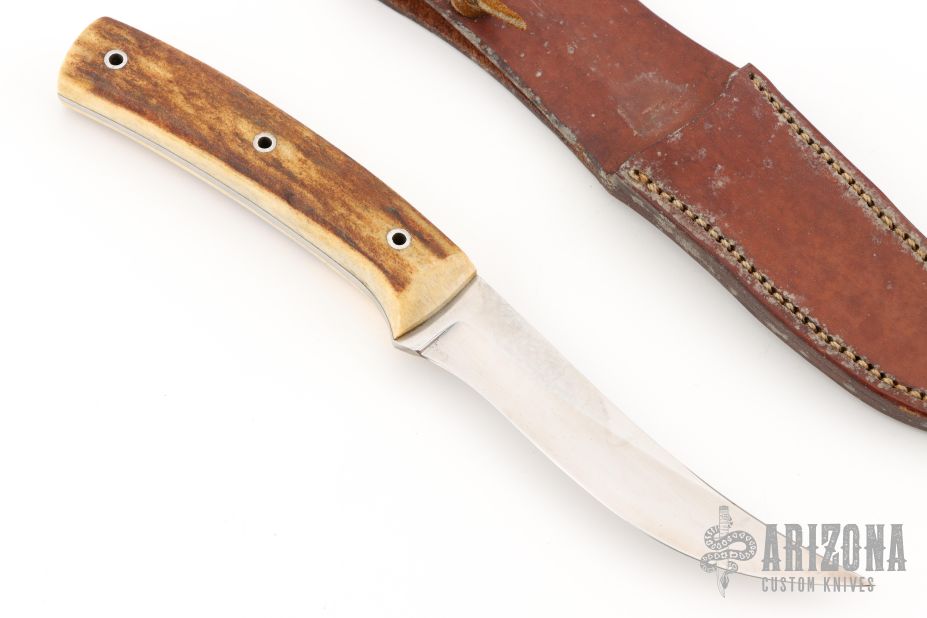 This Hunter by Mel Pardue features a satin finished blade with .131" blade stock and .885" blade depth, full tapered tang construction. The handle has stag scales. Comes with a brown leather sheath. Has some light scratches, otherwise excellent condition.