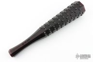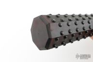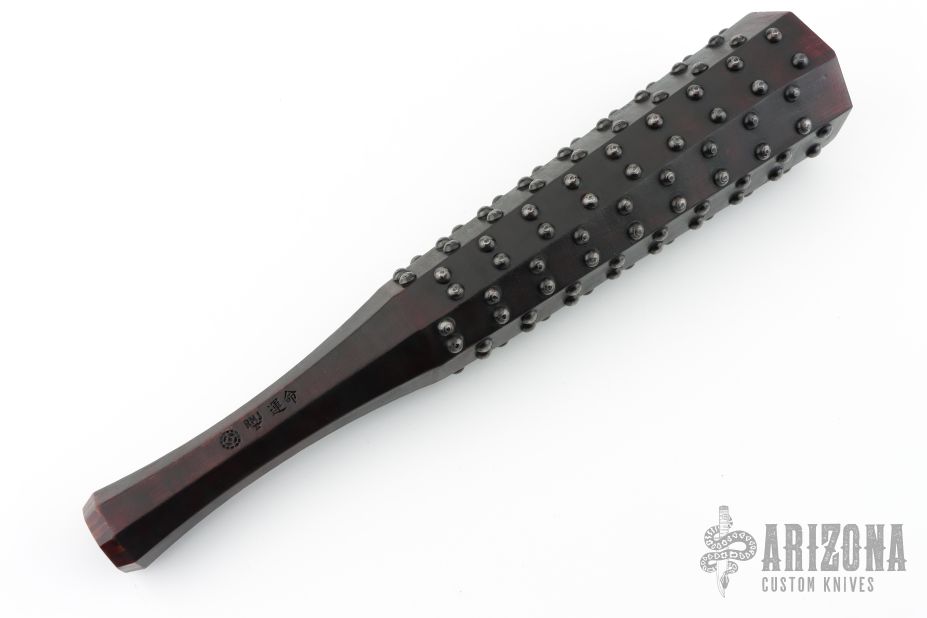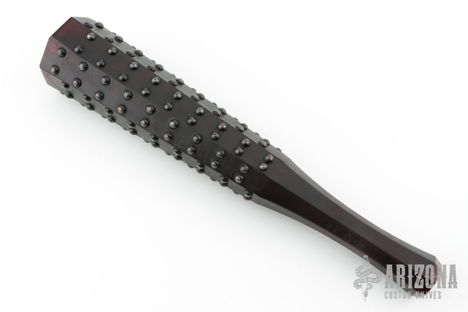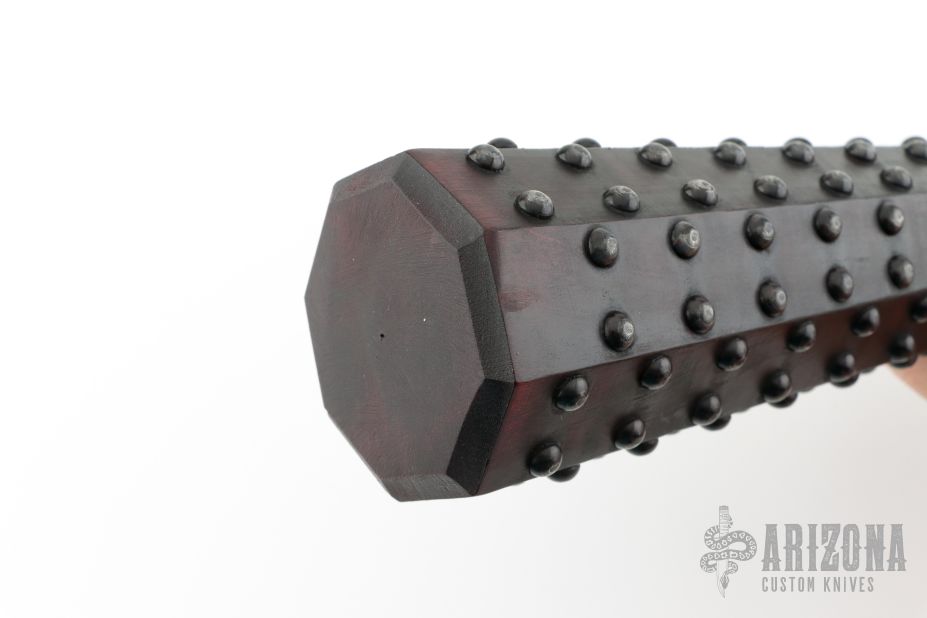 Ryan's love for creating historical pieces with his modern twists are evident in his Large Tetsubo war club. Each of these 6 pound studded octagon smashers are made from 4" x 30" square blanks of Tennessee Hickory. The 8 facets of the octagon have evenly spaced fire scaled black iron studs. Every Tetsubo is marked with "Destiny" in kanji characters,Ryan's makers mark, and his 2023 mark. Each one is shaped using power carving techniques, then hand sanded and finished with a hand rubbed, home brewed, old school finish. If needed, the finish can be easily maintained with a coat of black furniture wax periodically to restore the elegant depth. These are another great addition to your RMJ war chest!