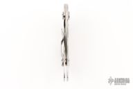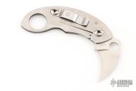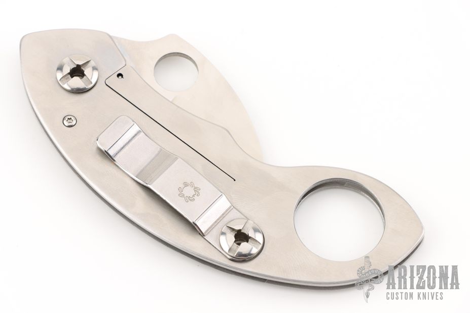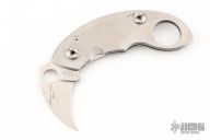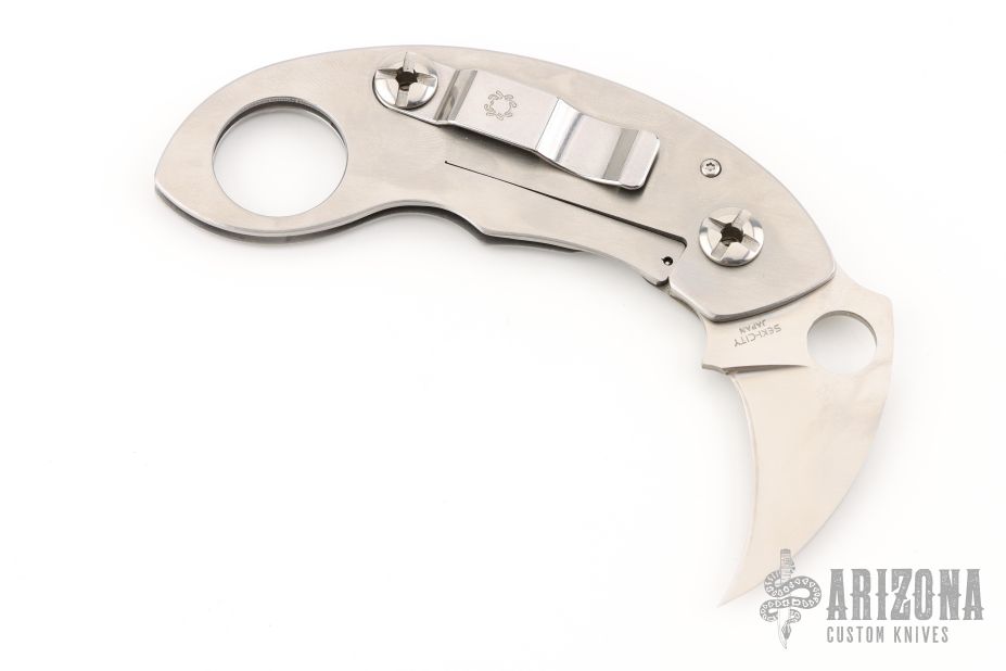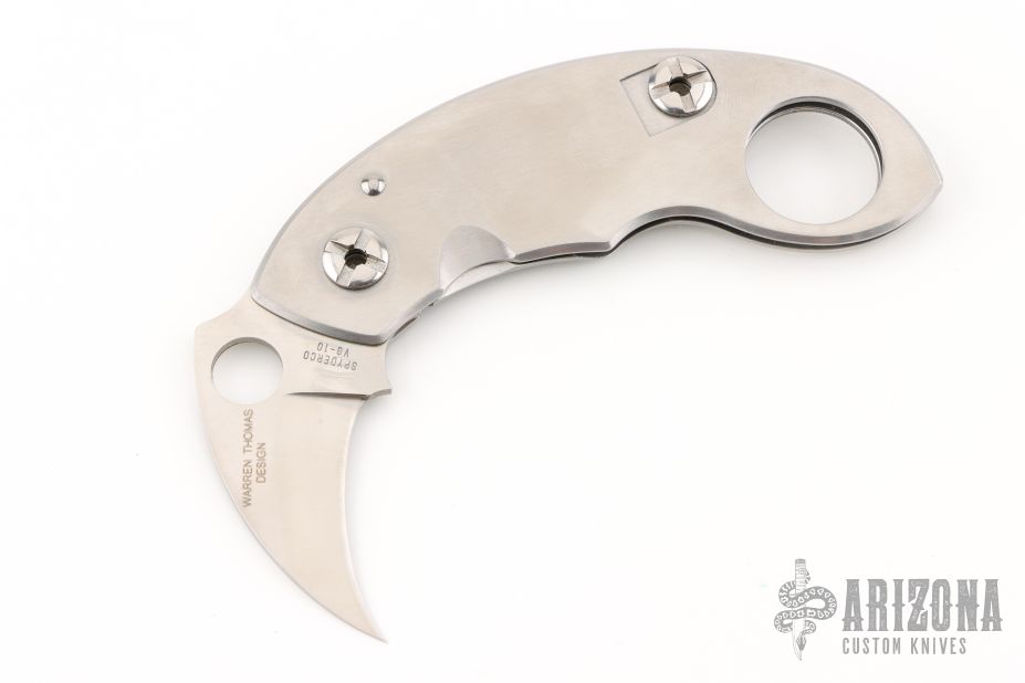 "Our Thomas/Spyderco folding Karambit is all-stainless with an arcing blade shape that carries through into a curved handle creating, in a sense, a large claw. Positioned at the end, for an index or pinky finger, the ring lets you to swing/rotate the blade into different grip positions. When closed an accessible nick/recess in the steel handle channels the thumb to, and then over, the Spyderco Round Hole for immediate blade deployment. To facilitate opening the blade even quicker, the hole is expanded to 13mm in diameter. On the backside, the handle scale is laser cut into a Chris Reeve Style integral Linerlock. The blade is made from VG-10 and double flat-ground with a finger guard behind the cutting edge and a sizable thumb-positioning spine cusp above the hole. These ergonomics merge making the piece feel comfortably curved and easily controlled in the hand. A flat, broad steel clip completes the package and is outfitted with the necessary hardware to position for tip-up/tip-down and left- or right-hand carry. Discontinued Product - No Longer Available." Excellent condition.