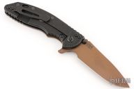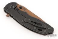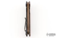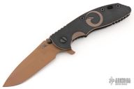 This XM-18 Flipper by Rick Hinderer Knives features a 3.5"  oil rubbed bronze finished blade, notched thumbrest and flipper, dual thumbstuds. The handle has a black/brown G-10 scale, and a battle black titanium handle and black finished hardware, and titanium clip. Clip can be mounted for tip up or down carry. Nice lockup, seating, and detent. Comes with original box and extra washers. New condition. Origin Collaboration