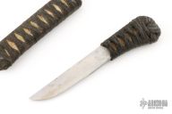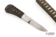 This knife by Phill Hartsfield features a chisel ground blade, .252" blade stock and .650" blade depth, hidden tang construction. The handle has black cord wrap. Comes with a cord wrapped paper lined metal sheath. Has some light scratches and patina, otherwise excellent condition.