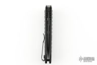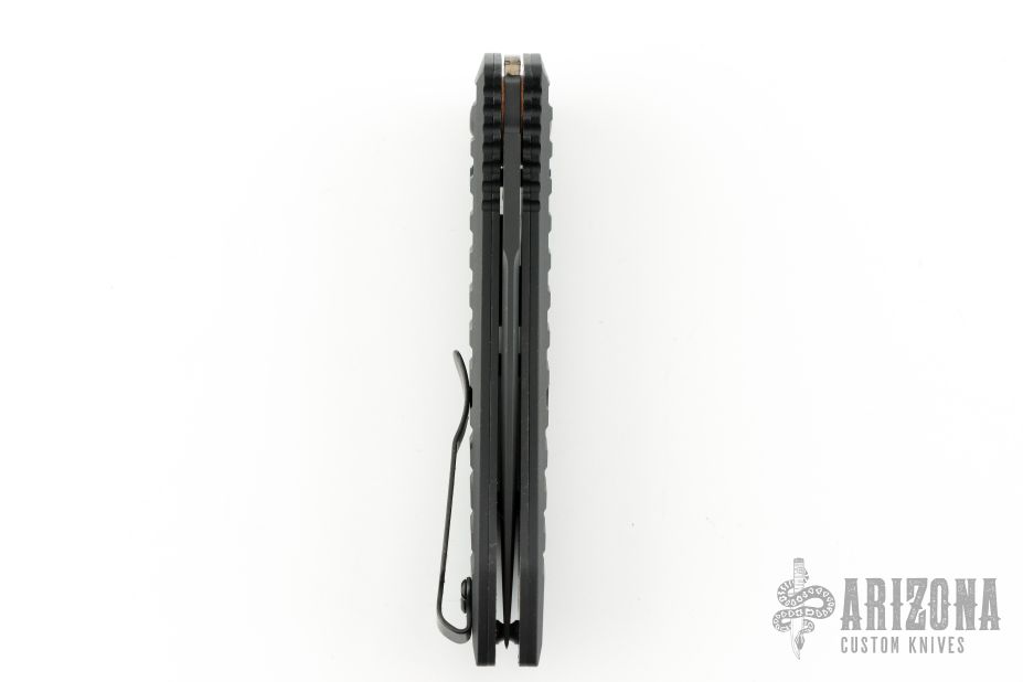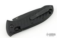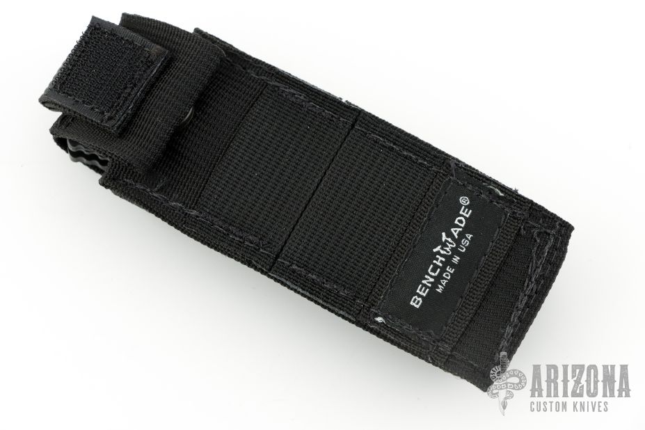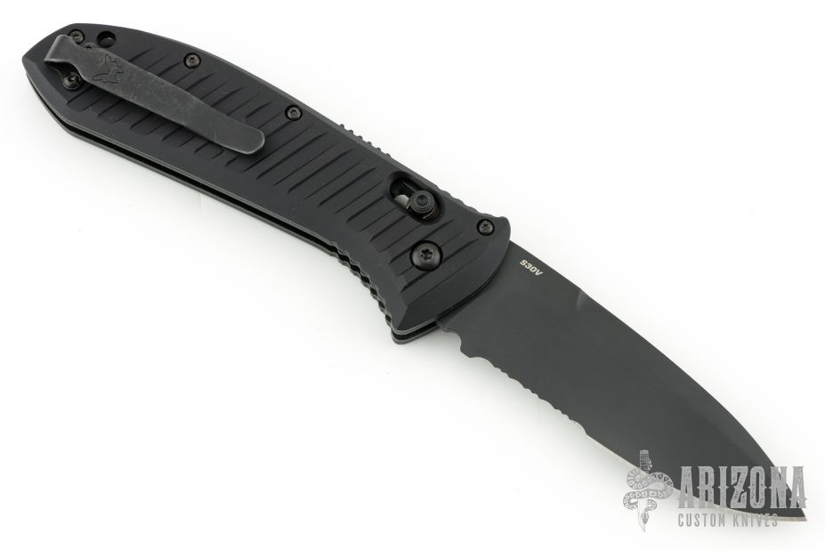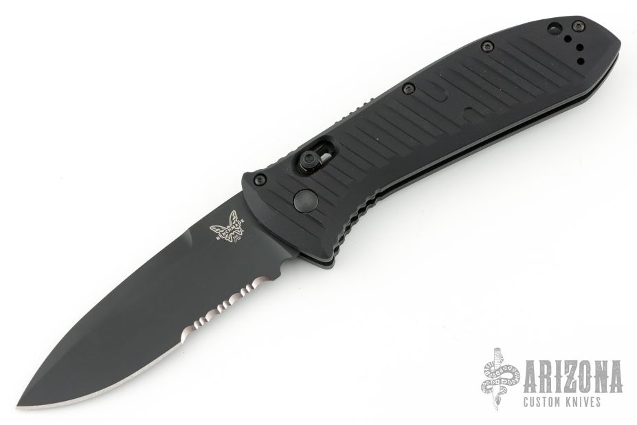 This automatic Presidio II model sports a black aluminum handle and a black finished blade with a partially serrated edge. Benchmade has updated their legendary Presidio model with significant ergonomic and performance upgrades. This combat legend has a black anodized 6061-T4 billet aluminum handle with Benchmade's AXIS lock system for effortless one-handed opening and closing. Milled grooves in the handle improve grip while adding a modern flair to the design. The Presidio II has a slightly larger blade and handle that is built to perform well as a tactical or everyday carry knife. Item includes a Cordura sheath with snap retention and a Malice Clip. 6061-T6 billet aluminum handle offers a tough build without weighing you down. Dual thumb studs, reversible pocket clip, and an AXIS® lock mechanism provide a fully ambidextrous design. Blade is made from CPM-S30V steel for maximized strength and cutting performance. Comes with original box, sheath and papers. Excellent condition.