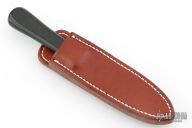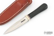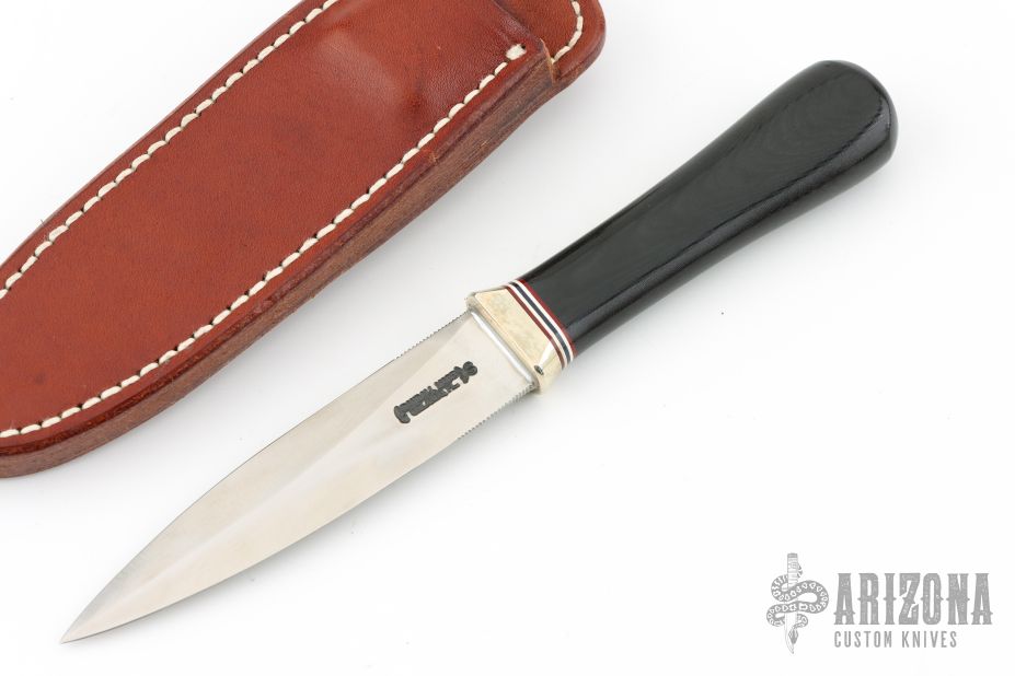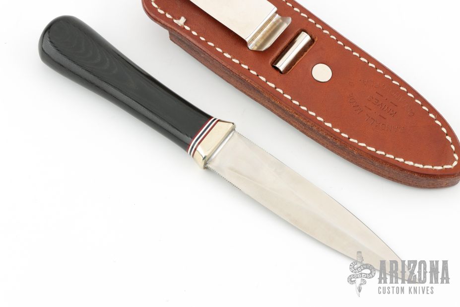 This Model 24 Guardian by Randall Made Knives features a satin finished double-edged blade with notched finger rests, .108" blade stock and .858" blade depth, hidden tang construction. Black linen micarta grip with red/white/blue spacers and a nickel silver guard. Both edges of the blade are sharpened with 1" of thumb notches. This model was designed in 1978 for use by police, undercover agents and law enforcement personnel for self-protection and as a back-up weapon. Comes with a brown leather sheath w/ boot clip and a zippered case. Excellent condition.